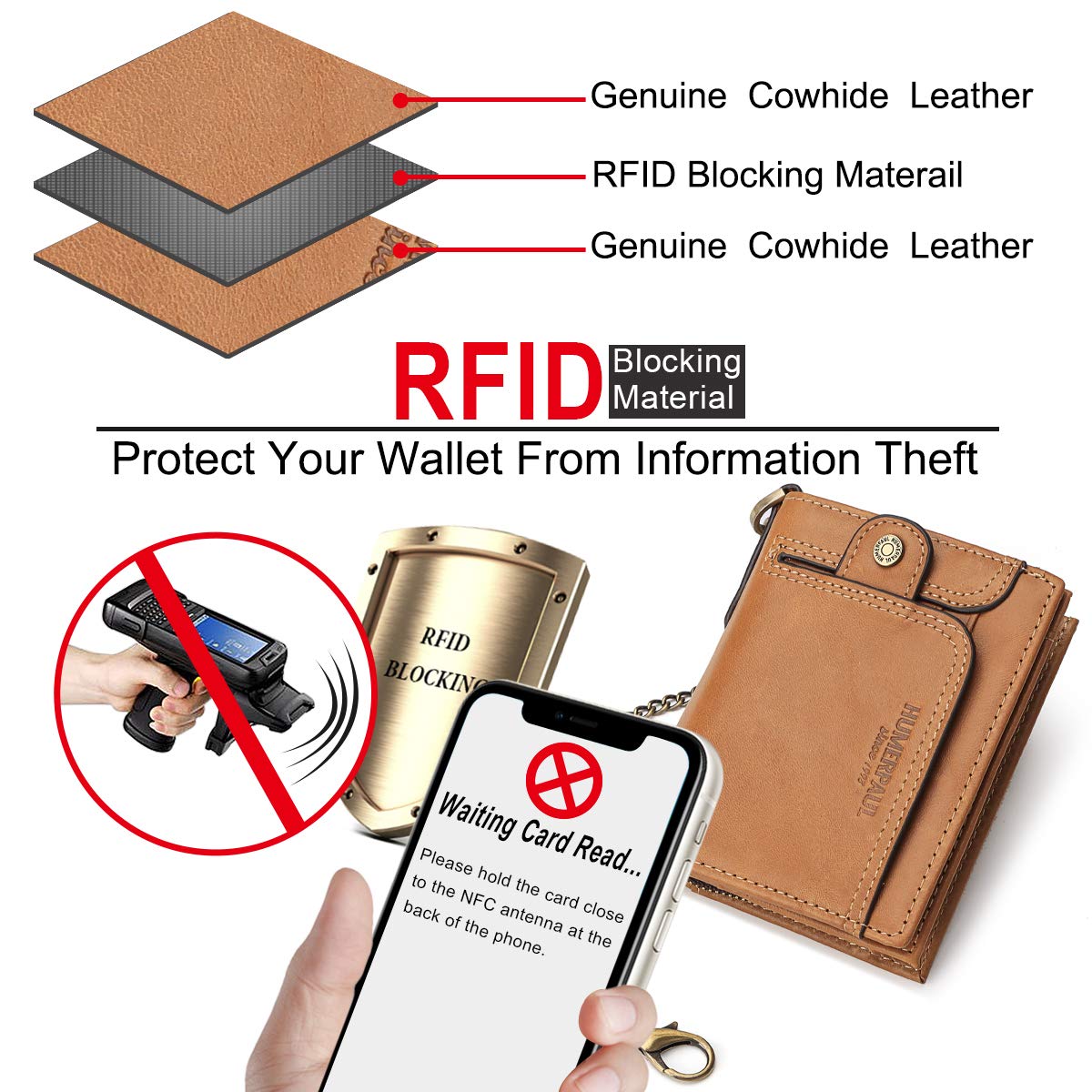 Skórzany portfel z: Skórzany portfel z łańcuszkiem – portfel z łańcuszkiem i blokadą RFID (po zamknięciu) ma wymiary 9,5 x 11,5 x 2,5 cm. Łatwy do przenoszenia i trzymania, można go włożyć do torby lub trzymać w ręku. Ten bezpieczny skórzany portfel z blokadą RFID jest wyposażony w łańcuszek zabezpieczający (ok. 25 cm)