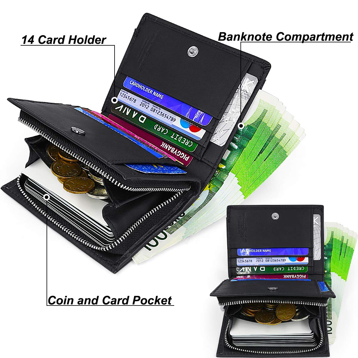 ✅ Duża pojemność: męski: Duża pojemność: męski portfel skórzany ma 14 kieszonek na karty ( z blokadą RFID po zamknięciu portfela), 1 kieszeń na banknoty, 1 kieszeń na monety i karty zamykaną na zamek błyskawiczny. Zewnętrzna kieszeń portfela umożliwia łatwe wyjmowanie często używanych kart. Kieszenie na zamek błyskawiczny i