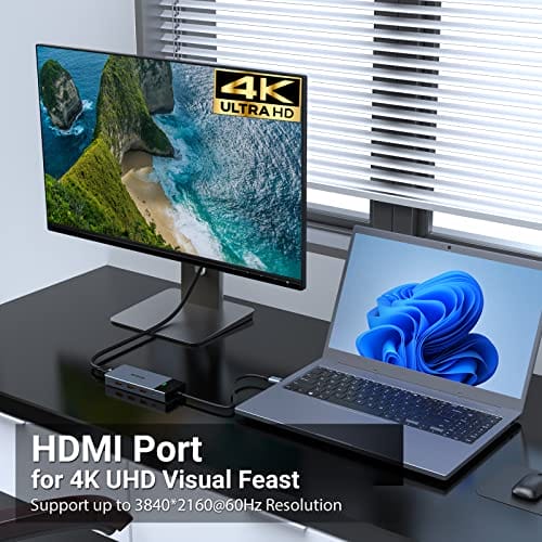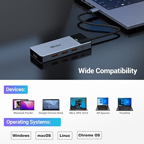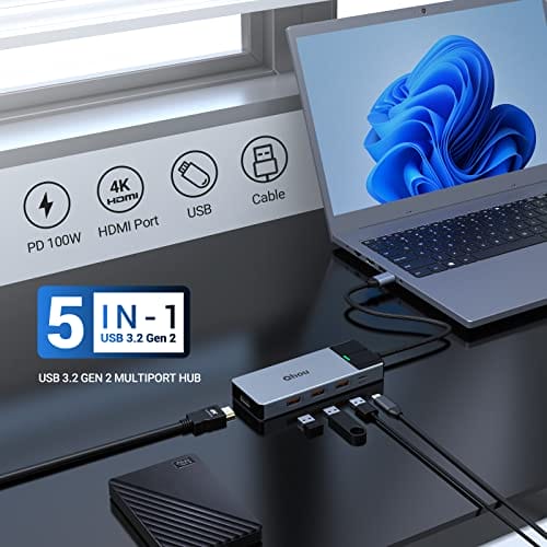 Koncentrator USB C podwójny wyświetlacz 5 w 1 adapter USB C (4K 60 Hz HDMI port 3 porty USB 3.2 100 W PD) Hub USB typu C to wszechstronne urządzenie, które zapewnia rozszerzone możliwości podłączania różnych urządzeń do MacBooka Air/Pro/iPada/Surface oraz komputerów z systemem Windows 10, 8, 7, XP/Mac. Jest to niezastąpiony dodatek dla osób, które potrzebują większej liczby portów USB i dodatkowego wyjścia HDMI.