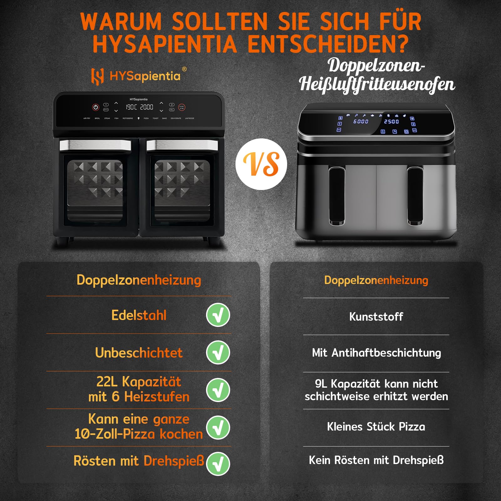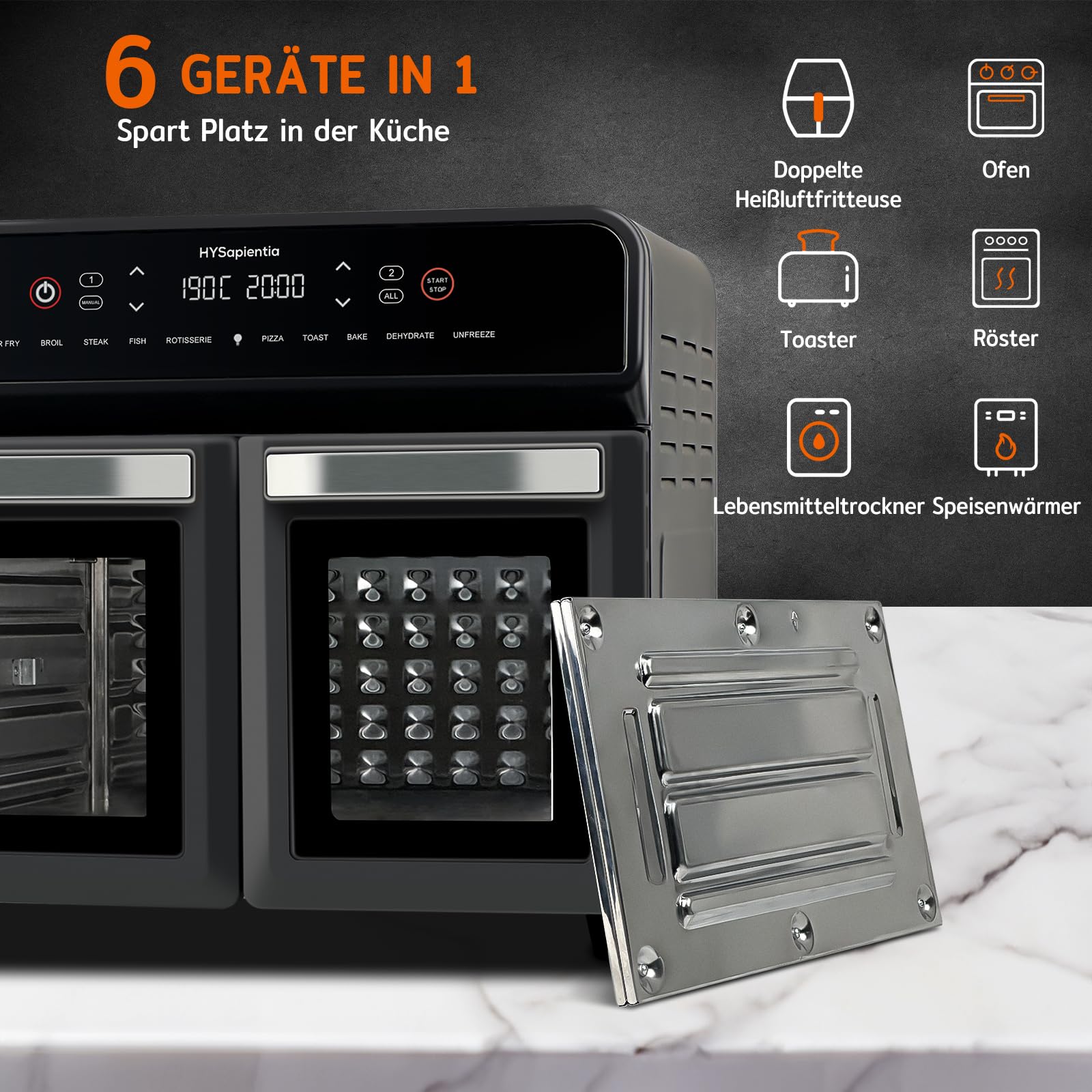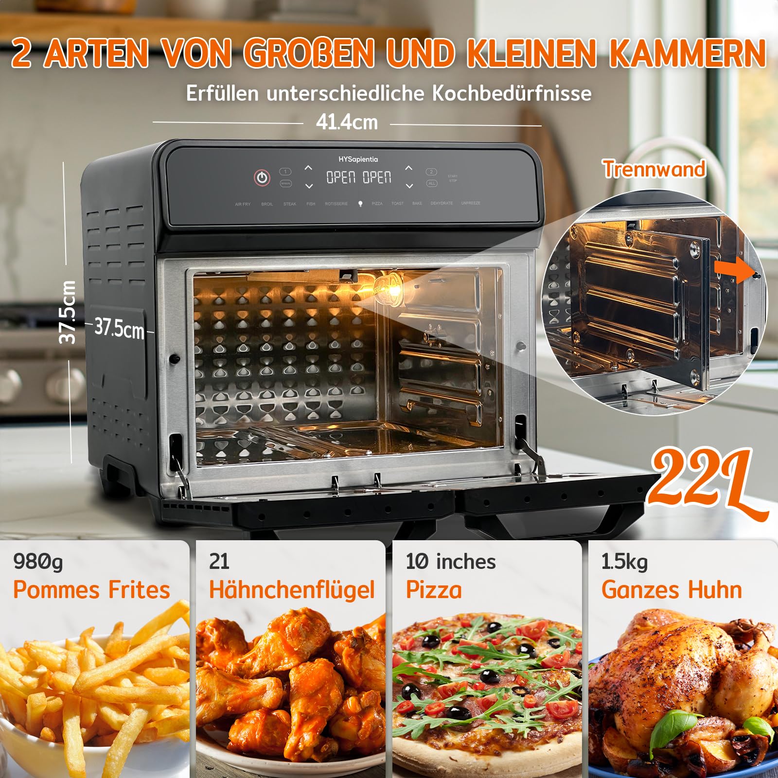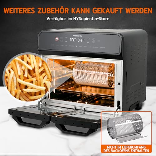 HYSapientia 22 l frytkownica na gorące powietrze, 2 komory, XXL, mini piekarnik z termoobiegiem, ekran dotykowy LED, 10 programów, frytkownica na gorące powietrze Dual Zone, dwa tryby gotowania z