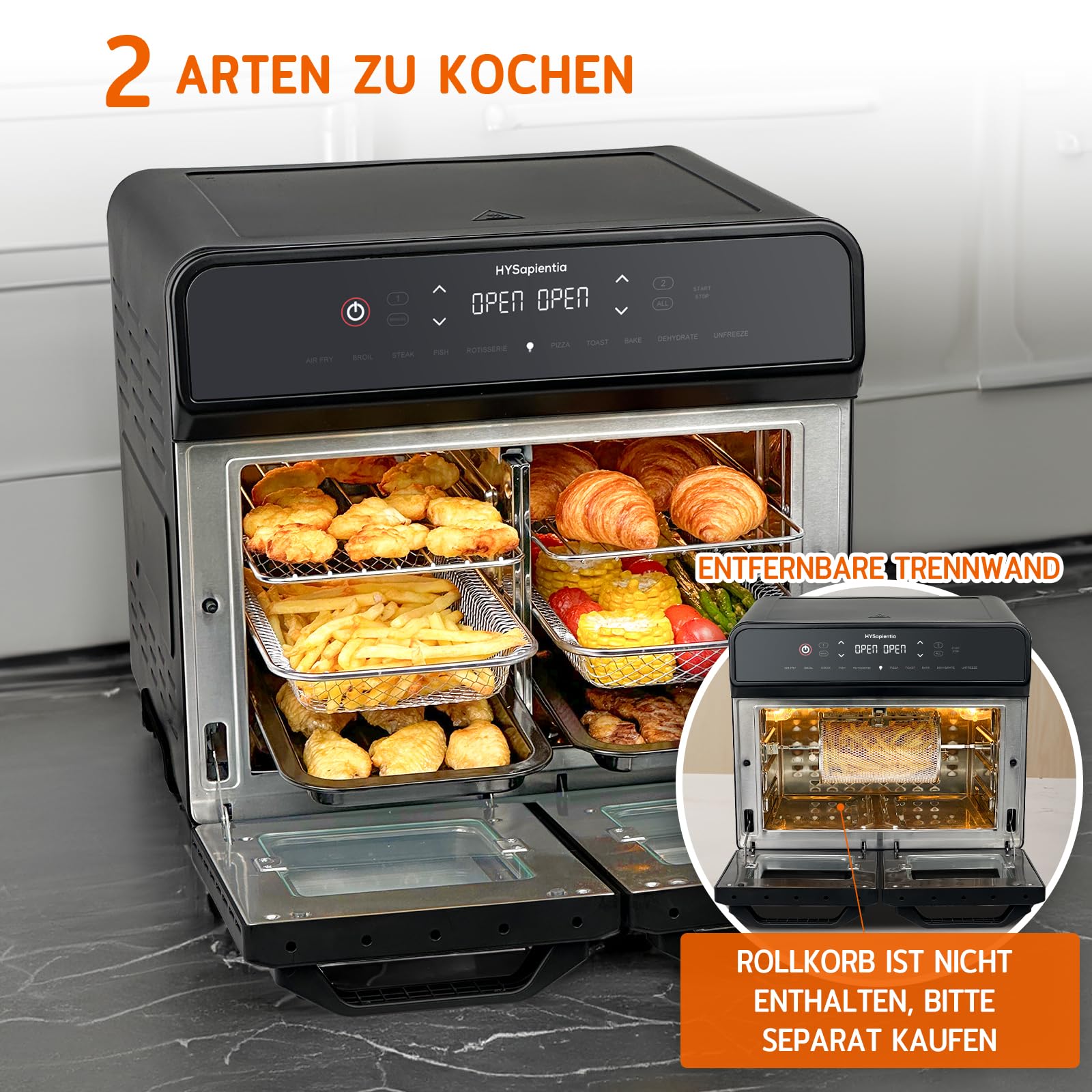 ✅ Konstrukcja o podwójnej: Konstrukcja o podwójnej pojemności. Mini piekarnik oferuje dwie oddzielne strefy lub dużą strefę 22 litrów. Użyj jednej strefy na małe porcje lub obie do różnych produktów spożywczych. Usuń separator, aby podgrzać całe danie, takie jak pizza lub pieczony kurczak. Każda strefa ma 3 poziomy, które umo