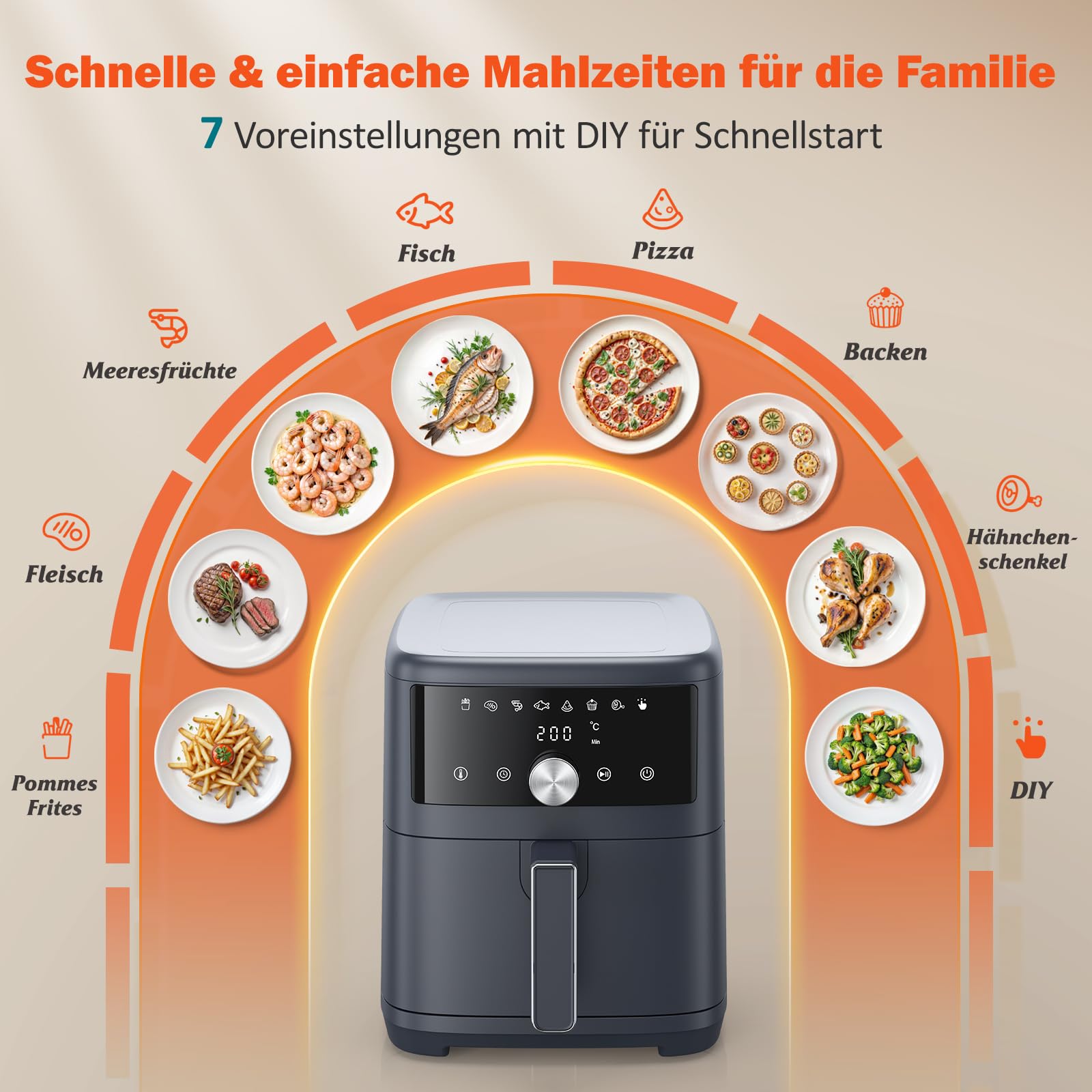 Frytkownica na gorące powietrze Innsky oferuje 7 wstępnie ustawionych programów gotowania, które umożliwiają szybkie i łatwe przygotowanie różnych potraw. Wystarczy jedno naciśnięcie przycisku, aby dostosować proces gotowania do własnych potrzeb. To doskonałe rozwiązanie dla zapracowanych osób, które chcą cieszyć się pysznymi posiłkami, nie spędzając długich godzin w kuchni.