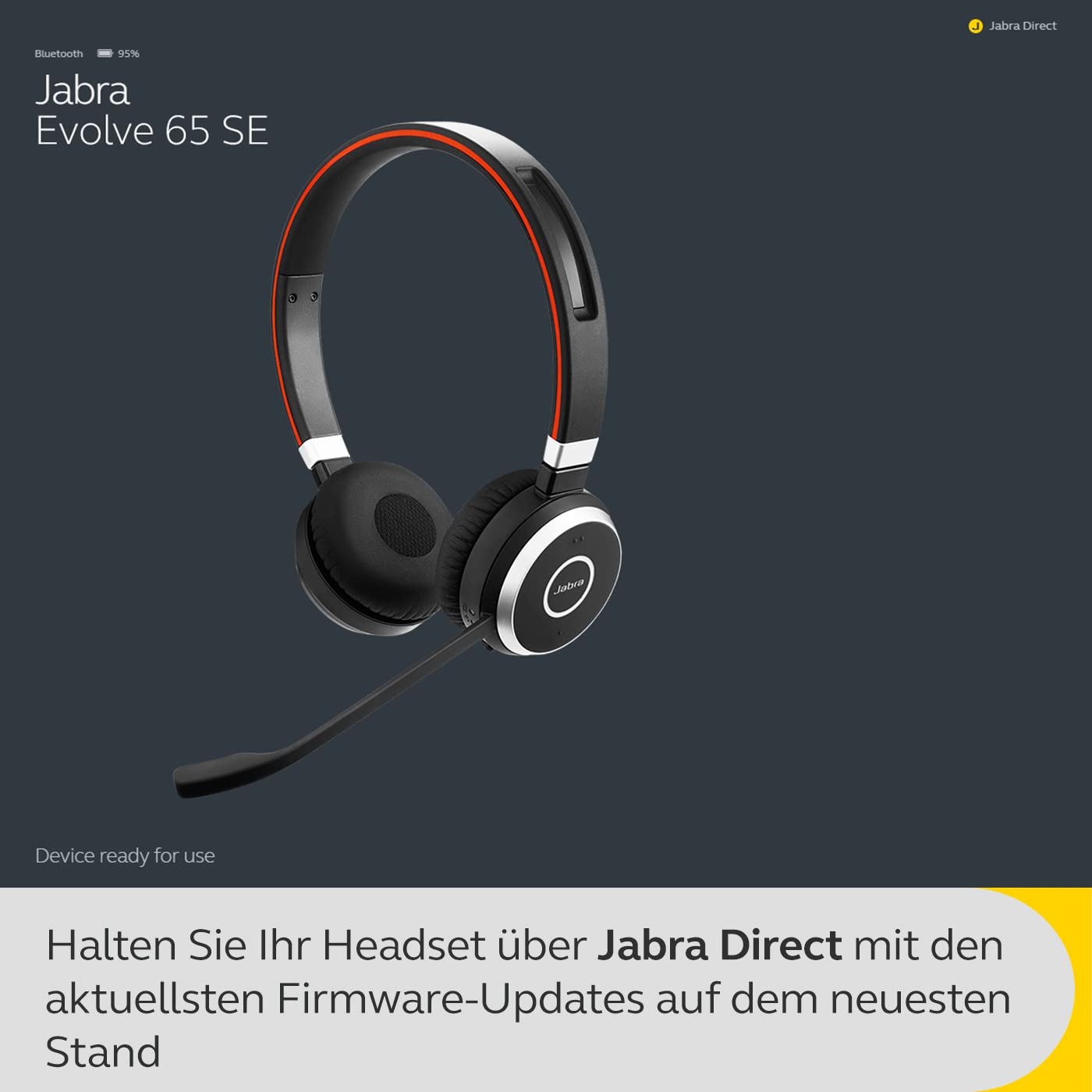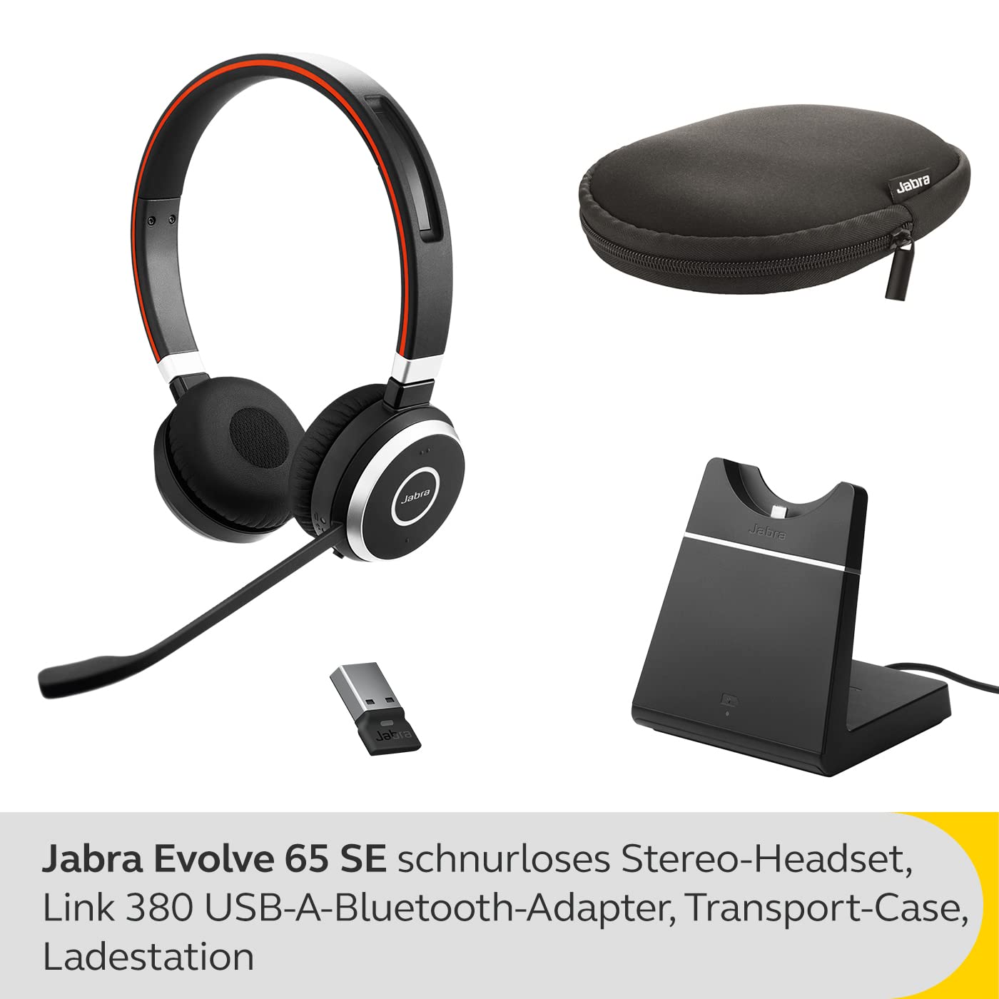 Jabra Evolve 65 SE – Bezprzewodowy zestaw słuchawkowy Bluetooth z mikrofonem redukującym szumy, długotrwałą baterią i podstawką do ładowania – Certyfikat UC dla Zoom, Unify i innych – Kolor czarny