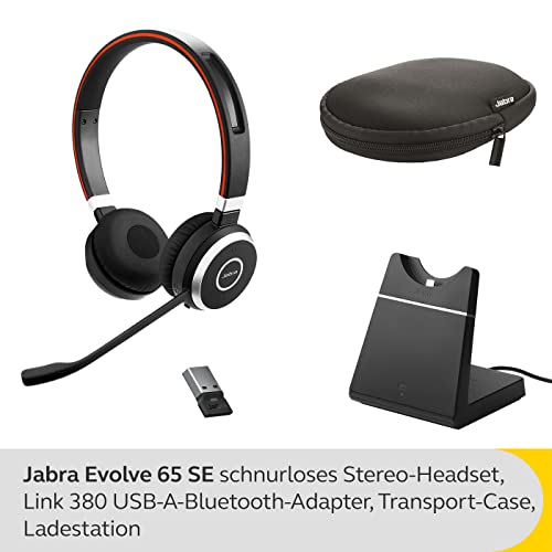 Jabra Evolve 65 SE – Bezprzewodowy zestaw słuchawkowy Bluetooth z mikrofonem redukującym szumy – Długa żywotność baterii i ładowarka – Certyfikat MS Teams – Kolor czarny