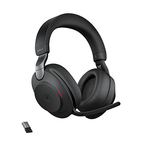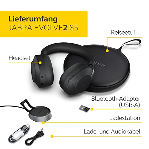 Jabra Evolve2 85 Wireless PC Headset mit Ladestation – Noise Cancelling Microsoft Teams Zertifizierte Stereo Kopfhörer mit langer Akkulaufzeit – USB-A Bluetooth Adapter – Schwarz
