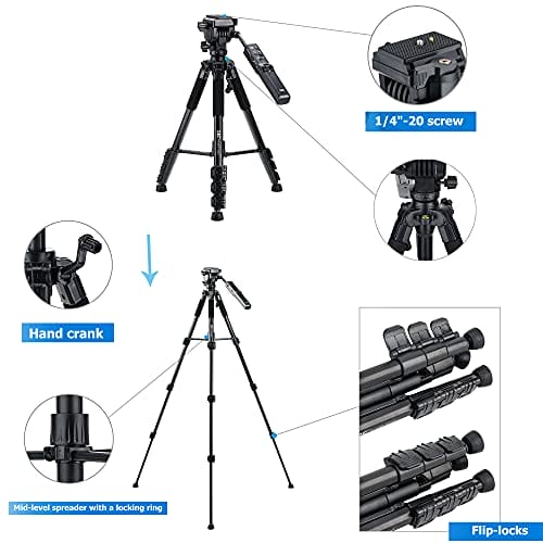 ✅ Płynne panoramowanie: Płynne: Płynne panoramowanie: Płynne przesuwanie i przechylanie dzięki głowicy płynu statywu. Umożliwia śledzenie obiektów pod różnymi kątami, dzięki czemu nie przegapisz żadnego ujęcia