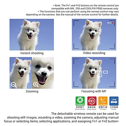 ✅ Funkcja zdalnego sterowania:: Funkcja zdalnego sterowania: fotografowanie zdjęć / nagrywanie wideo / powiększanie aparatu / regulacja ręcznej ostrości / wybieranie elementów lub aplikacji / przypisywanie przycisku Fn1 lub Fn2 (tylko dla aparatów Nikon Z6II Z7II Z fc Z50 i COOLPIX P950). Odległość robocza: ok. 10 m.