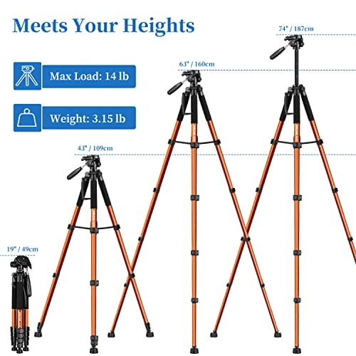 JOILCAN Statyw do aparatu Canon Nikon, lekki statyw 188 cm, ze zdejmowaną głowicą i uniwersalnym uchwytem na telefon, wzmocniony aluminiowy statyw do Vlog Live Streaming (pomarańczowy)