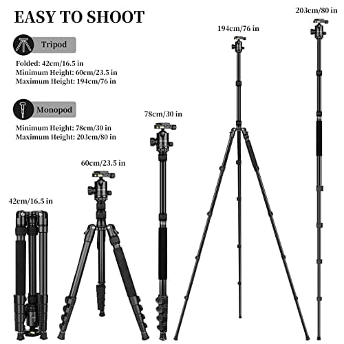 JOILCAN Statyw do aparatu 80-calowy to lekki i kompaktowy statyw podróżny, idealny dla profesjonalnych fotografów podróżujących lub pracujących na świeżym powietrzu. Statyw można złożyć do tyłu o 180°, co sprawia, że po złożeniu ma zaledwie 42 cm długości i waży tylko 1,7 kg. Dzięki wytrzymałej torbie na ramię, statyw jest łatwy do przenoszenia i można go zabrać ze sobą wszędzie.
