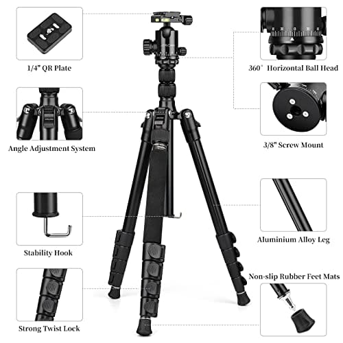 Statyw jest regulowany i elastyczny, dzięki 5-częściowym nogom z szybkozłączkami. Wysokość robocza można regulować od 60 cm do 203 cm w ciągu kilku sekund. Kąt statywu fotograficznego można dowolnie regulować, aby dostosować się do różnych warunków fotografowania i wymagań.