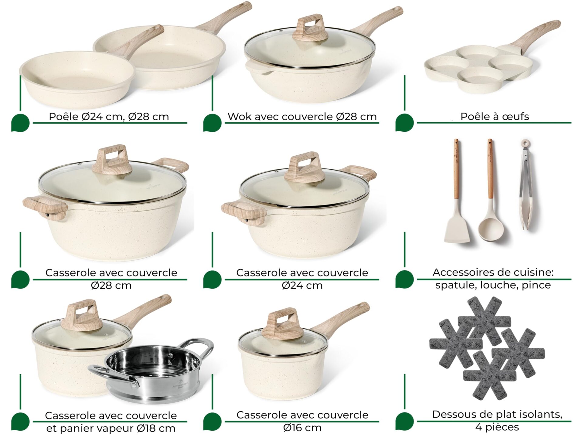 W skład zestawu wchodzą różnorodne naczynia, w tym patelnie, rondle oraz garnki, co czyni go wszechstronnym rozwiązaniem dla każdego kucharza, niezależnie od poziomu zaawansowania. Dzięki różnym rozmiarom i kształtom, zestaw idealnie sprawdzi się w przygotowywaniu zarówno prostych, codziennych posiłków, jak i bardziej skomplikowanych dań na specjalne okazje.