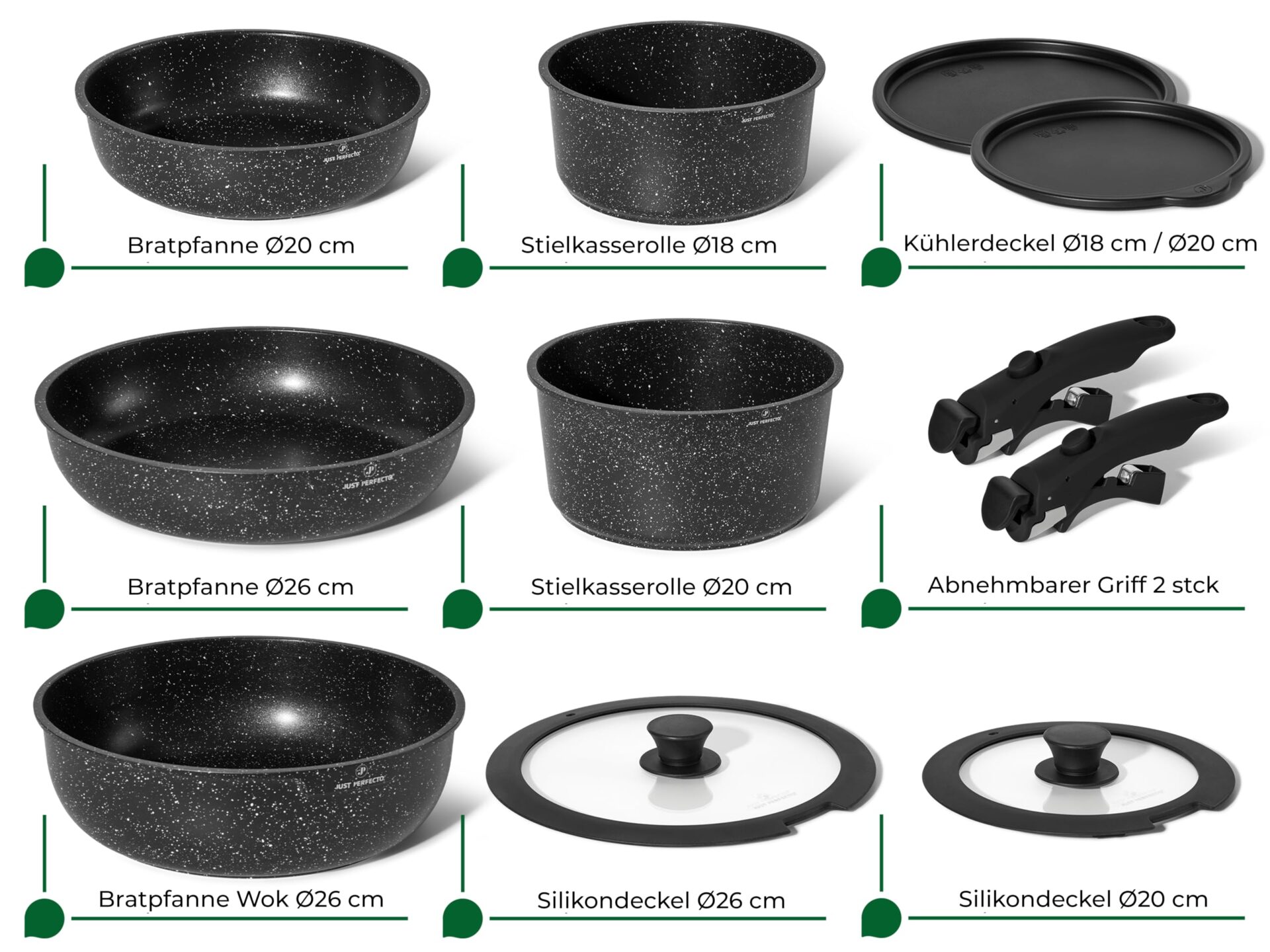 Zestaw garnków Just Perfecto to 11-częściowy komplet, który zrewolucjonizuje Twoją kuchnię. W skład zestawu wchodzą patelnie o średnicach 20 i 26 cm oraz garnki o pojemnościach 18 i 20 cm, co sprawia, że jest to idealne rozwiązanie dla każdego, kto ceni sobie funkcjonalność i jakość.
