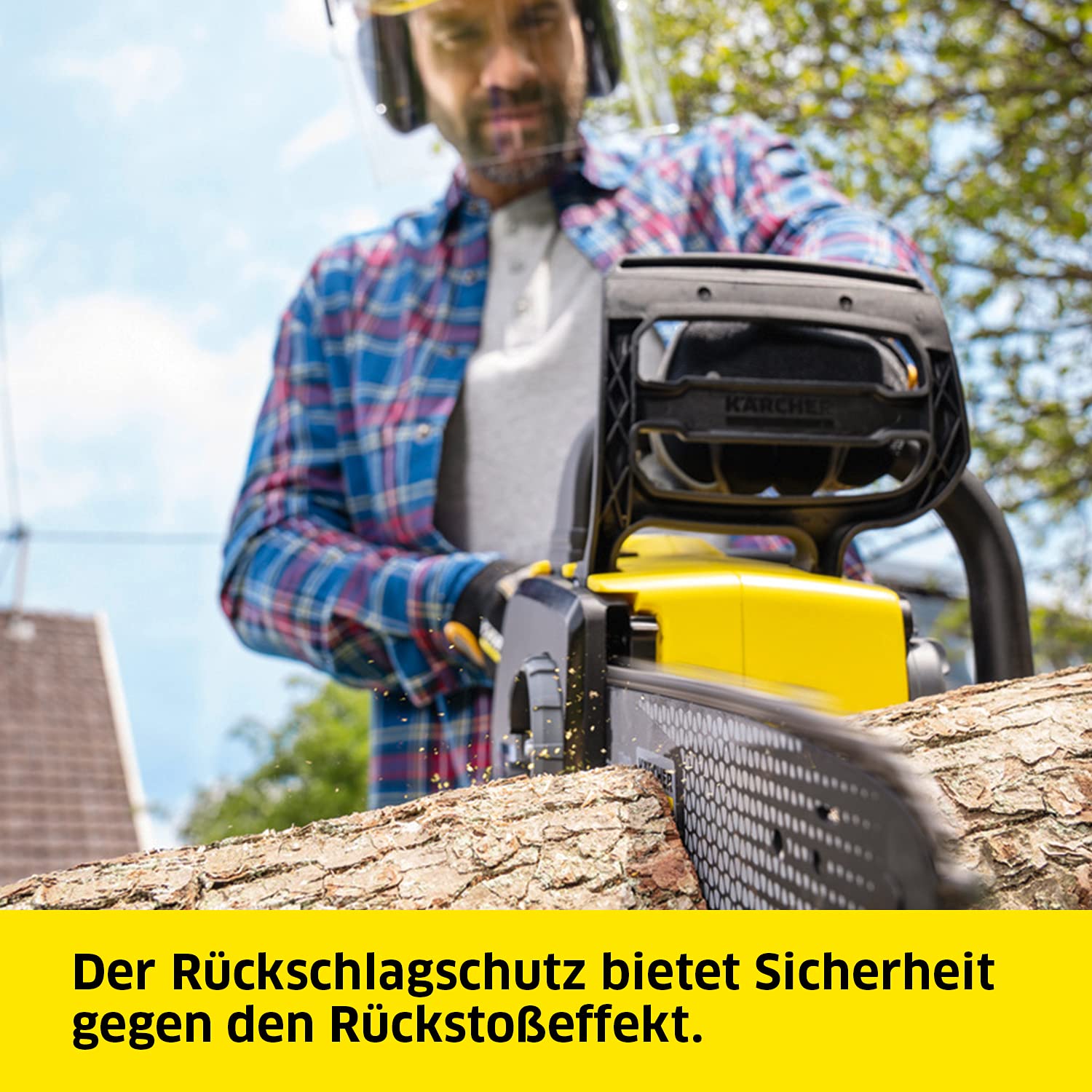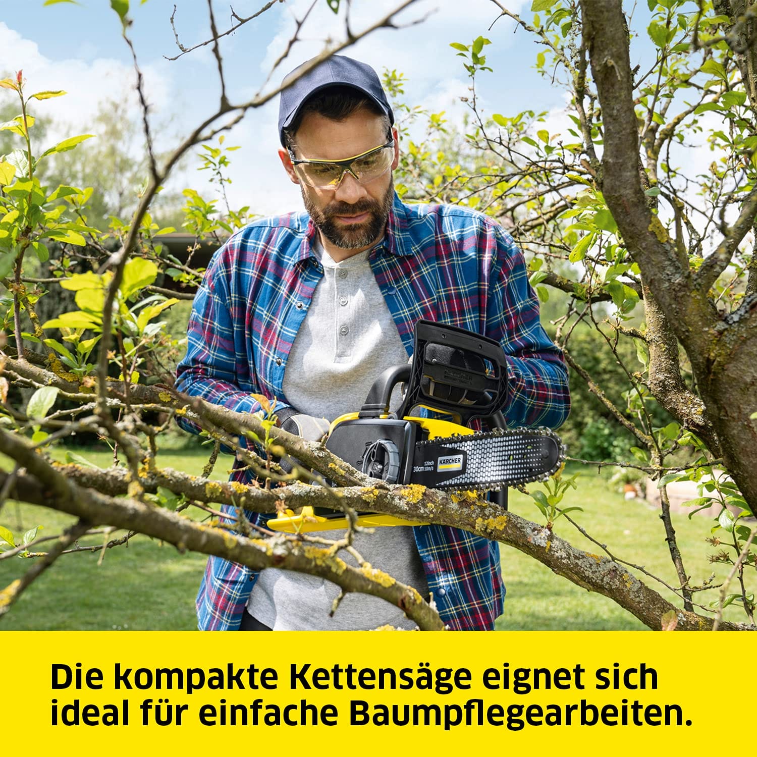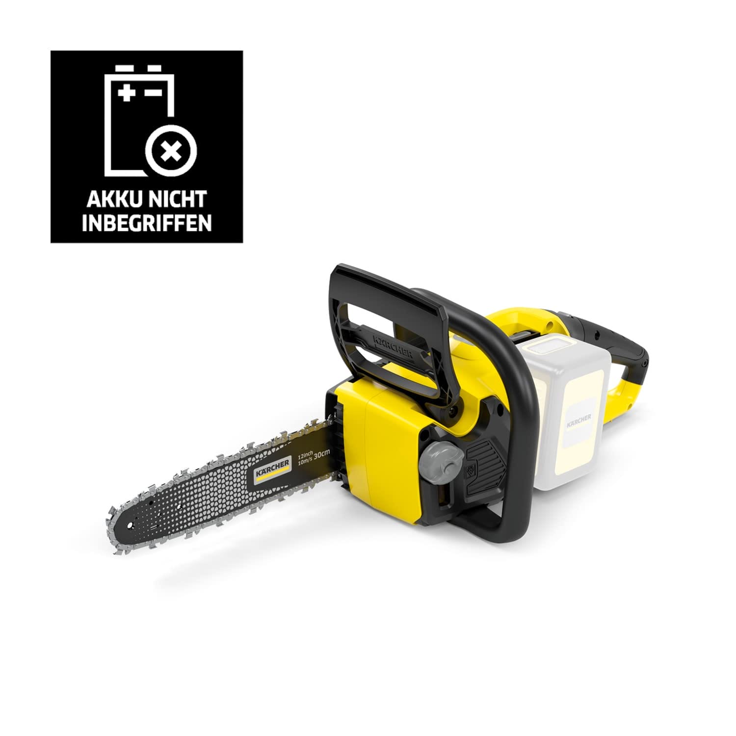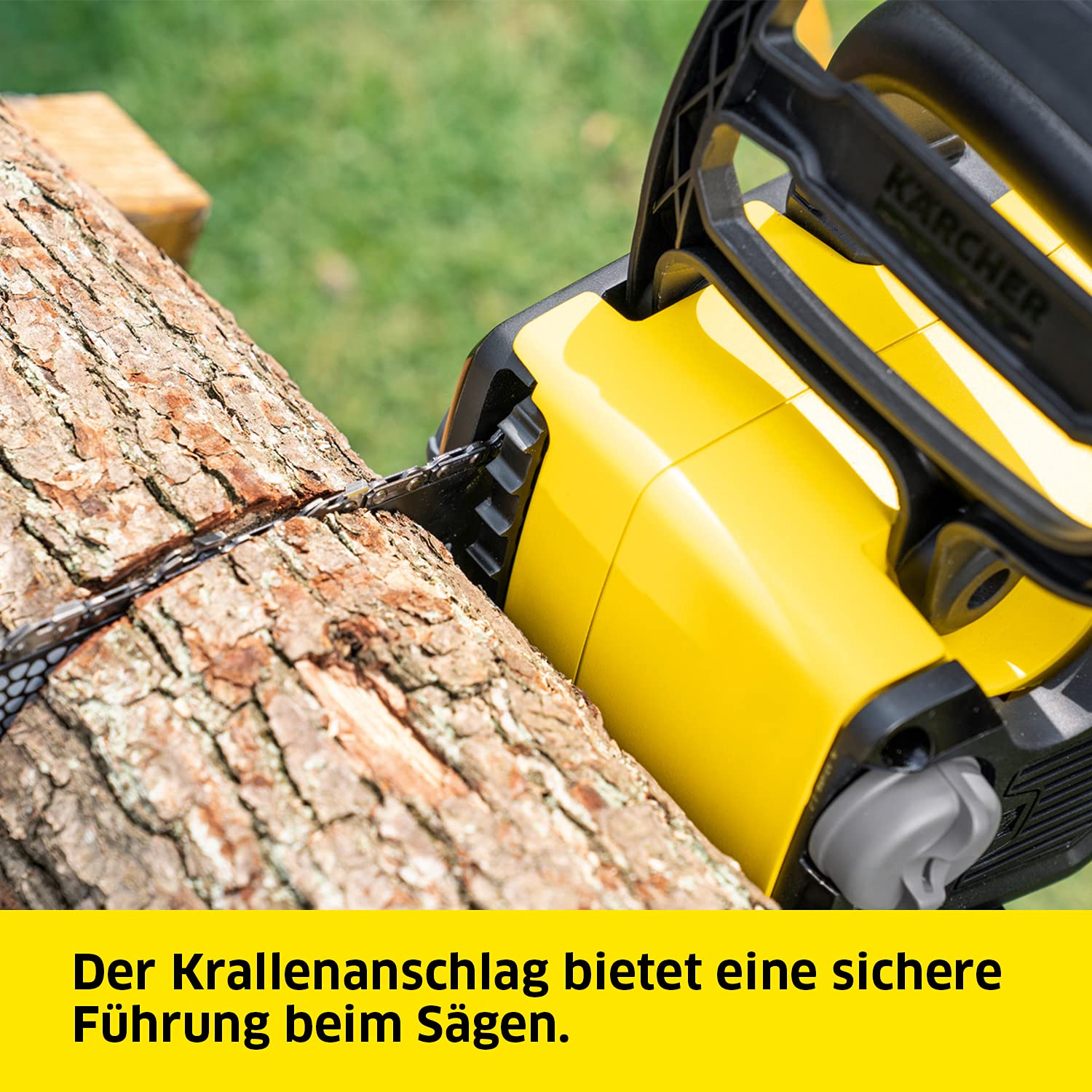 Akumulatorowa piła łańcuchowa Kärcher CNS 18-30 (długość ostrza 30 cm, prędkość łańcucha 10 m/s, wydajność na jednym ładowaniu: 75 cięć, waga 32 kg) żółto-czarna.
