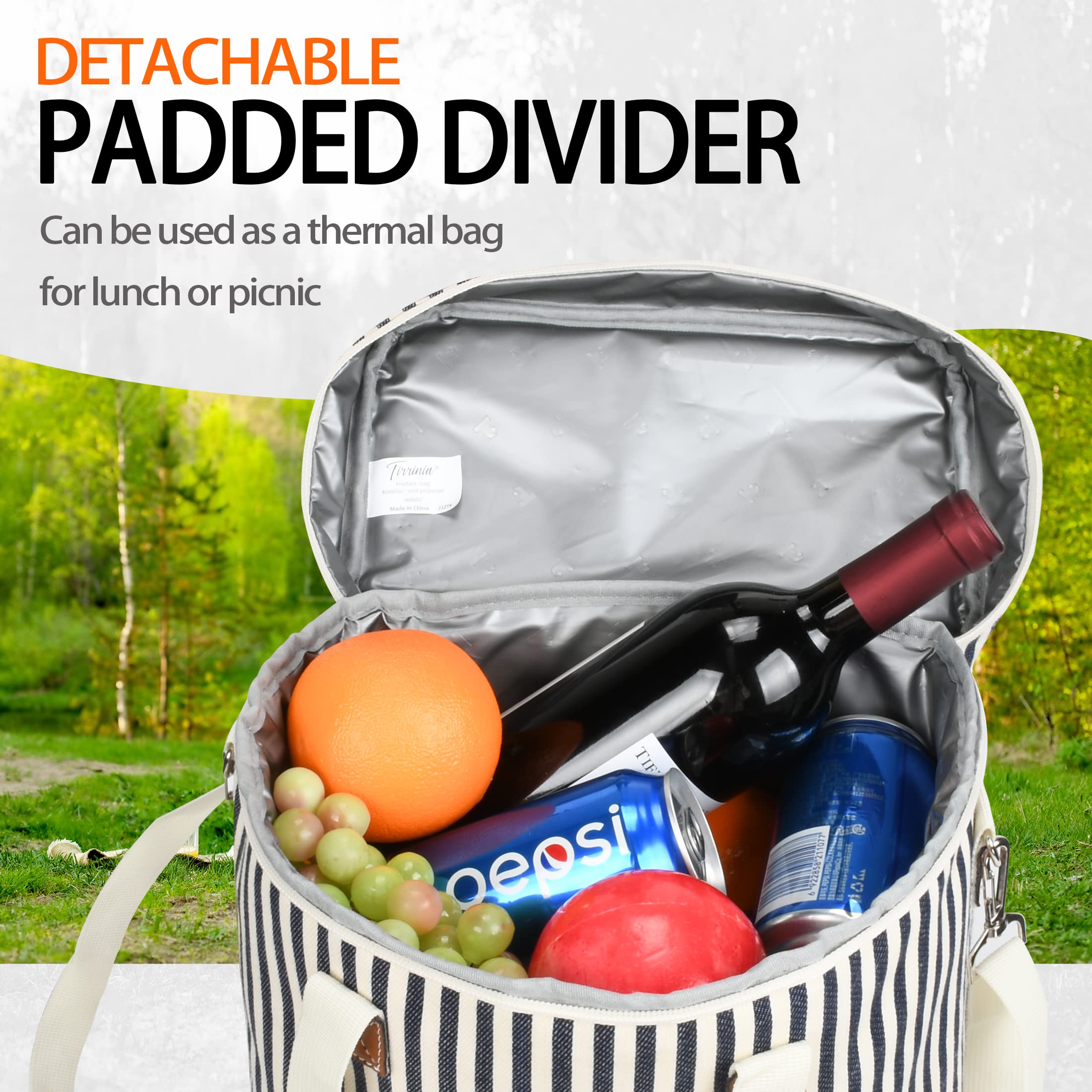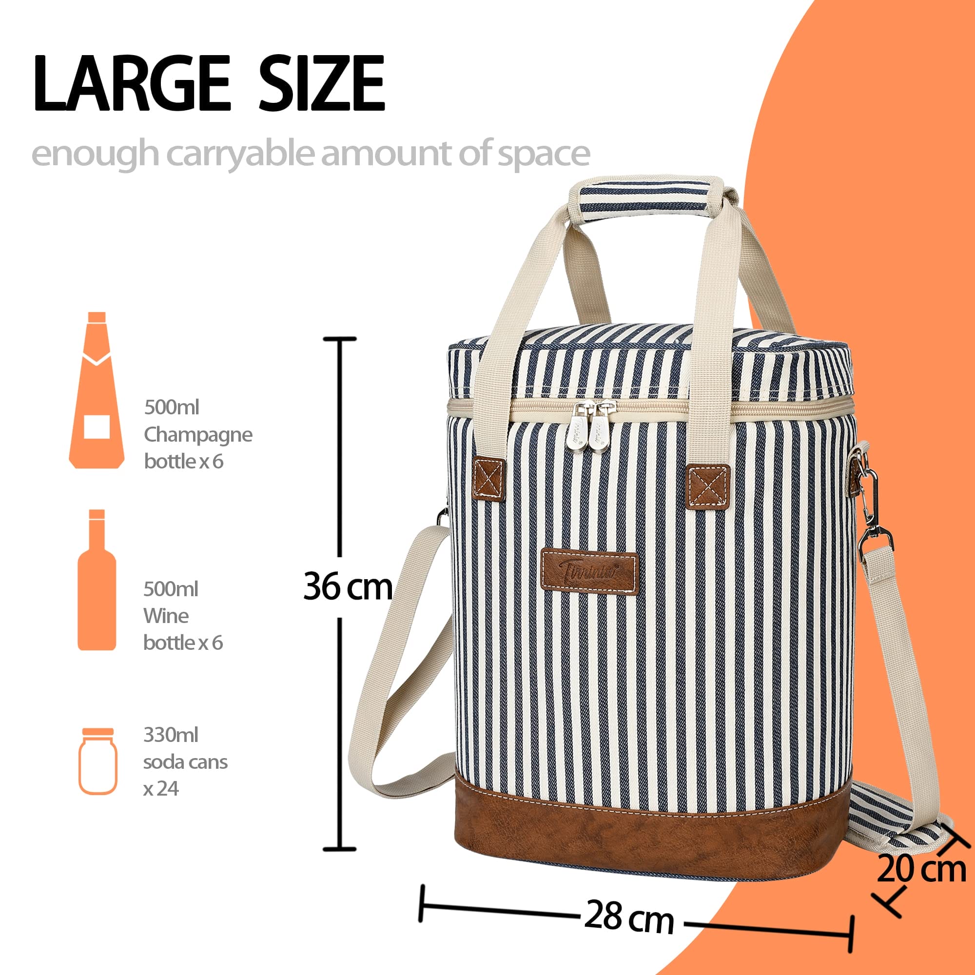 5. Duża pojemność – Torba ma wymiary 28 x 20 x 36 cm (dł. x szer. x wys.), co zapewnia wystarczającą przestrzeń dla 6 butelek wina o standardowym rozmiarze. Dodatkowo, tylna kieszeń jest praktyczna do przechowywania drobnych przedmiotów, takich jak papierowe ręczniki czy otwieracz do wina. Torba może również być używana do pikników lub transportu wody, napojów lub piwa. Po złożeniu można ją łatwo spakować i przechowywać.