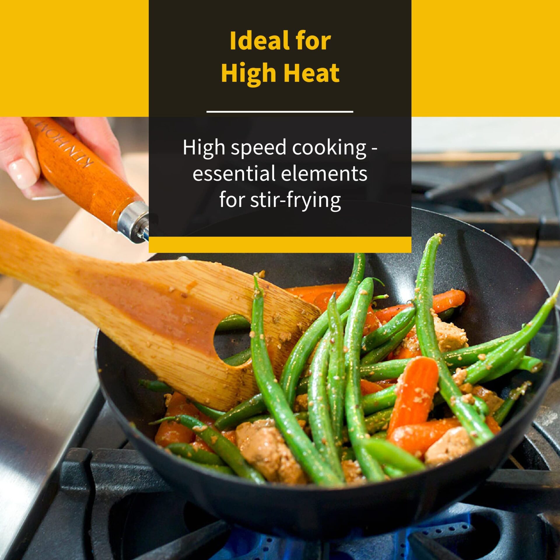 ✅ Lekki wok ze: Lekki wok ze stali węglowej wykończony podwójną powłoką zapobiegającą przywieraniu zaprojektowaną do smażenia w wysokich temperaturach