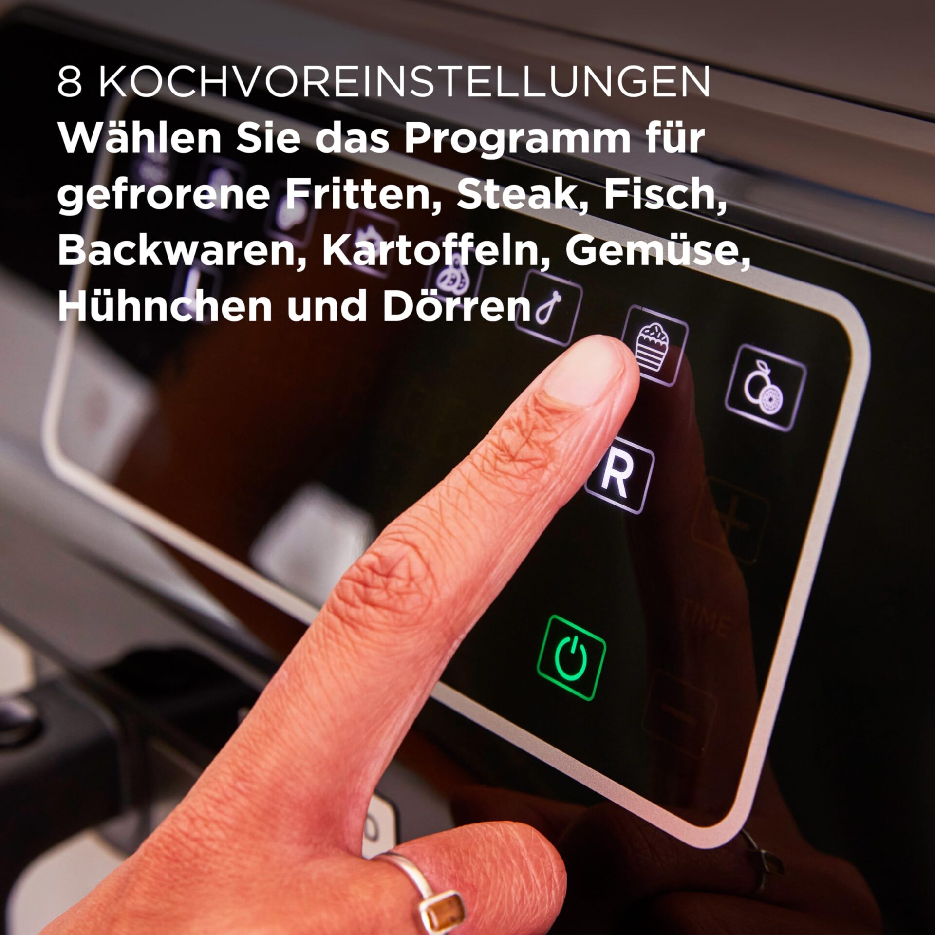 Kenwood kHealthy Fry Twin Airfryer oferuje aż 8 predefiniowanych programów. Dzięki łatwemu w obsłudze panelowi dotykowemu możesz szybko wybrać odpowiedni program do przygotowania frytek, mięsa, ryb, kurczaka, warzyw, ciast czy do dehydratacji owoców. Nie zapomniano również o opcji podgrzewania potraw. Przygotowanie posiłków stało się proste i przyjemne!