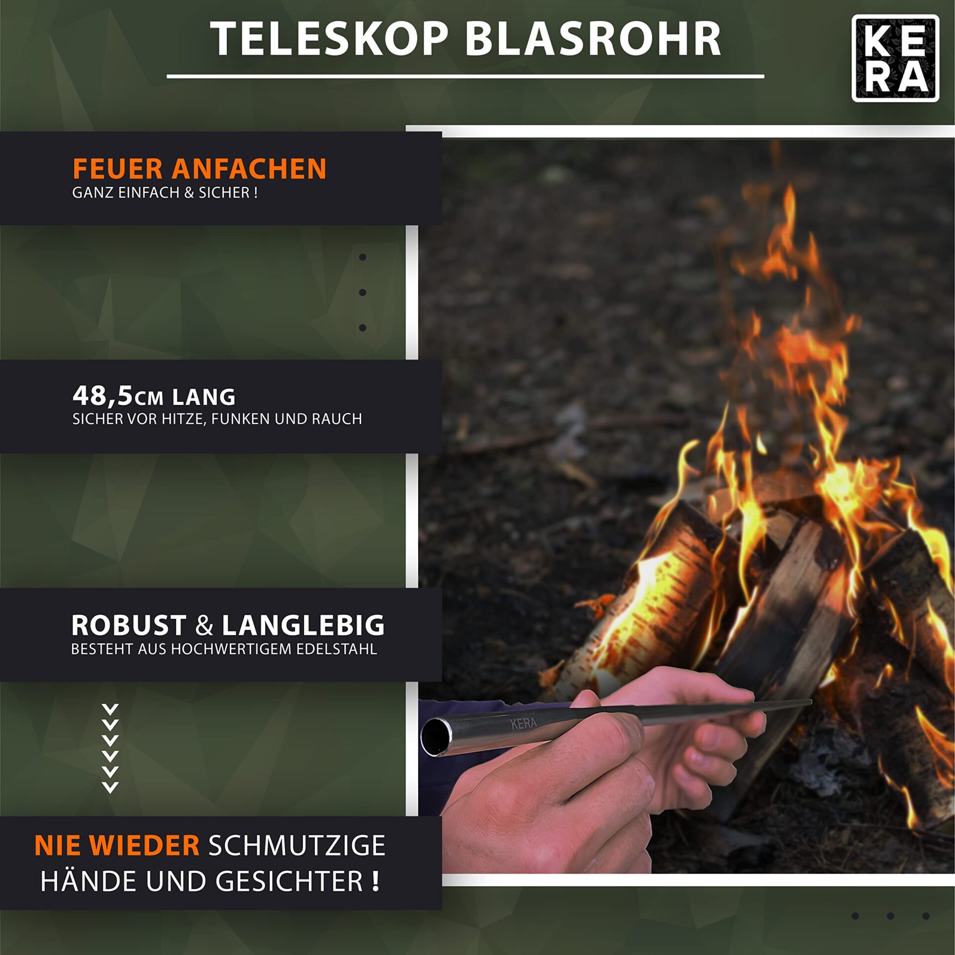 3. **Rura dmuchająca**: W zestawie znajduje się innowacyjna rura dmuchająca, która umożliwia efektywne rozpalanie ognia, nawet w trudnych warunkach. Dzięki niej można szybko i skutecznie podsycić ogień, co jest kluczowe w sytuacjach survivalowych.