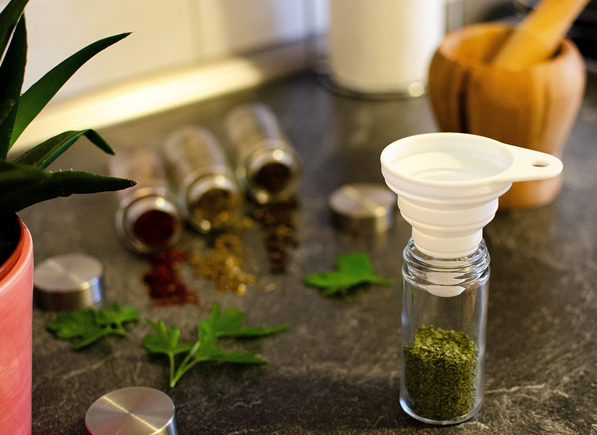 Zestaw Kesign dbający o szczegóły zawiera silikonowy lejek, który napełnianie słoików czyni dziecinnie łatwym. Dzięki odpowiedniej konstrukcji lejka, napełnienie nawet najmniejszych słoików staje się bezproblemowe, a Ty nie musisz obawiać się o zmarnowanie przypraw. Co więcej, jego składana konstrukcja sprawia, że jest łatwe do przechowywania, nie zajmując cennej przestrzeni w Twojej kuchni.