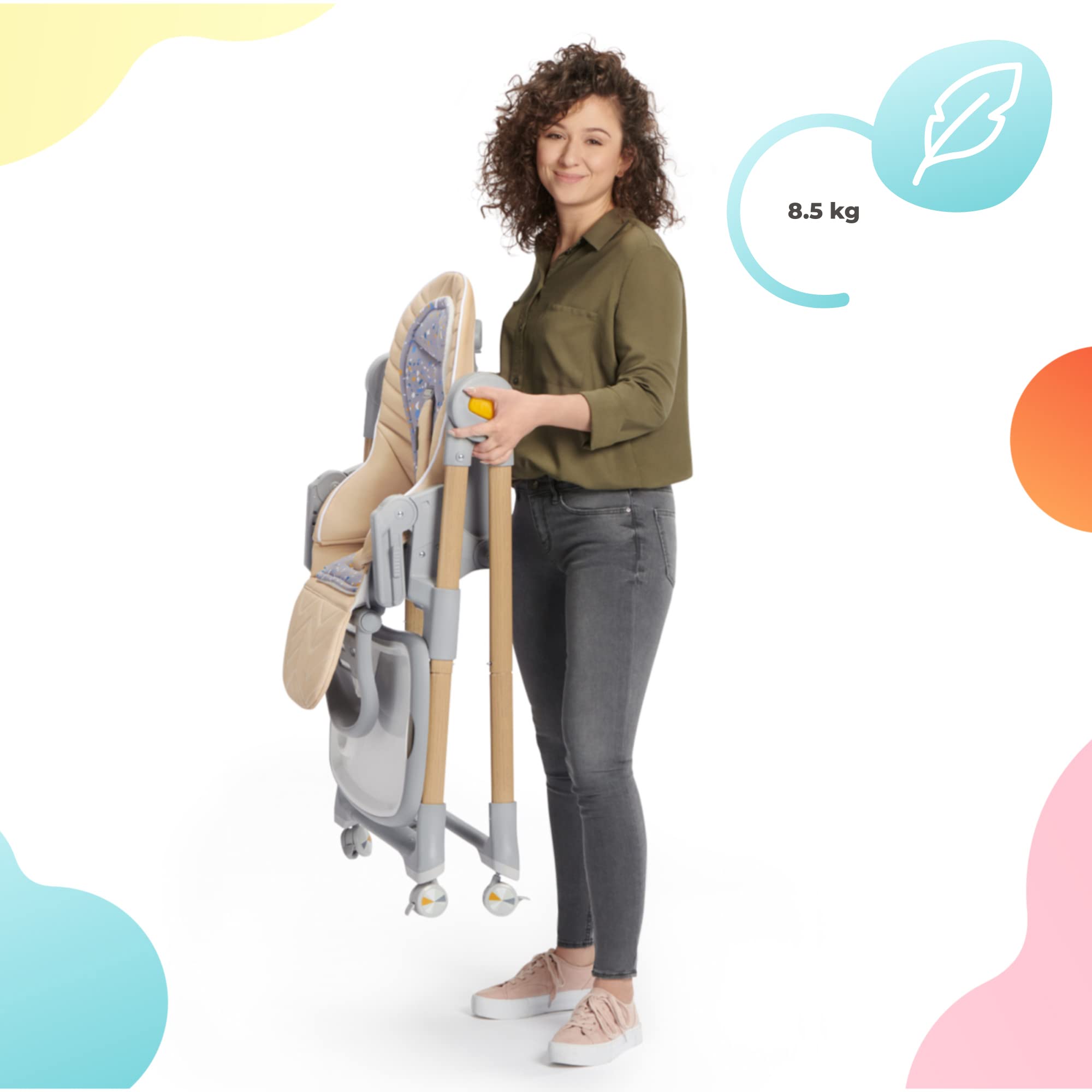 **Regulacja wysokości i oparcia**: Krzesełko oferuje możliwość dostosowania wysokości oraz kąta nachylenia oparcia do pozycji leżącej. To innowacyjne rozwiązanie pozwala na idealne dopasowanie do potrzeb dziecka, co jest szczególnie ważne w pierwszych miesiącach życia, gdy maluchy często zasypiają podczas jedzenia.