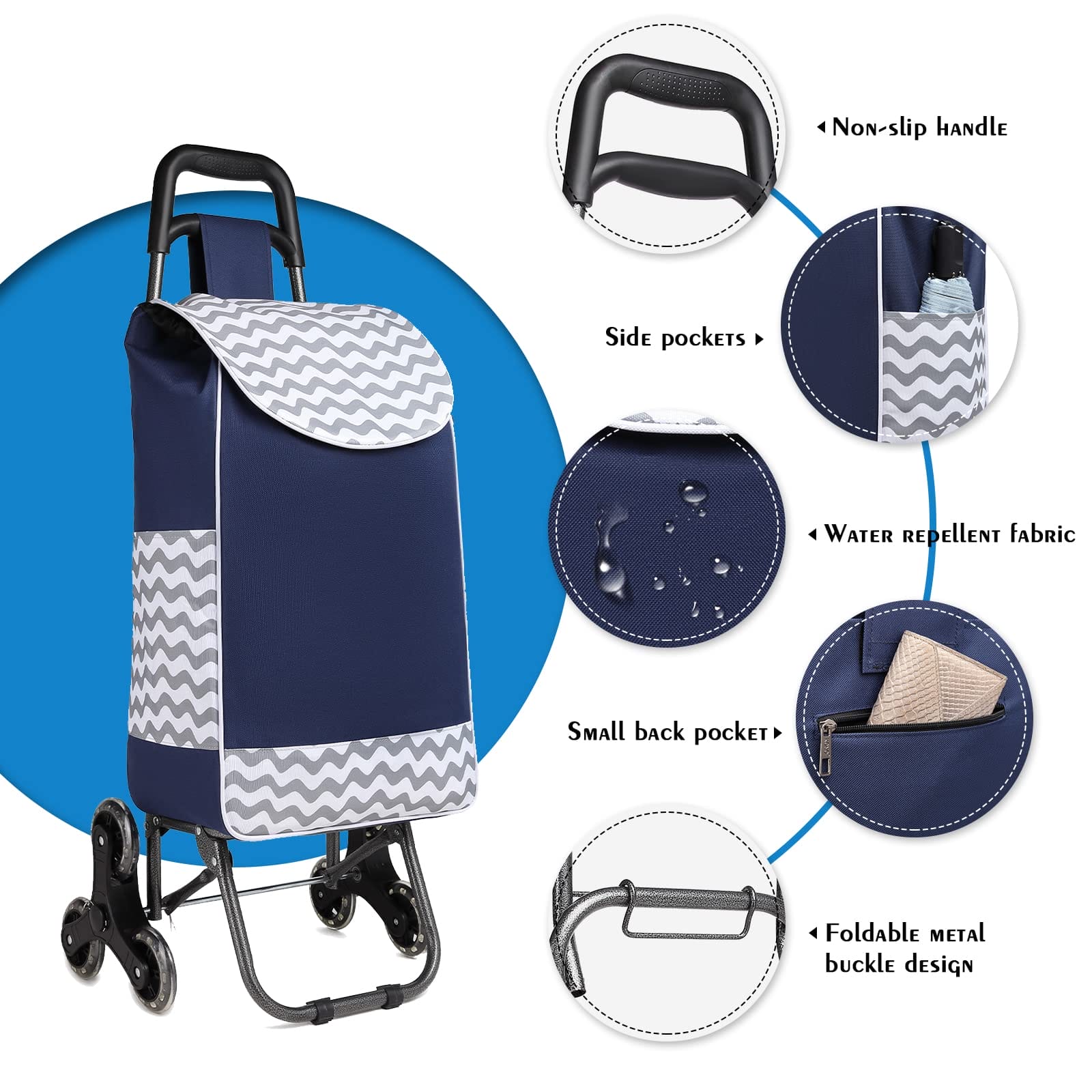 Kono Składany wózek na zakupy, lekki i wodoodporny, 2 w 1, z 6 dużymi, cichymi kółkami, rozkładany, do jazdy po schodach, na artykuły spożywcze, granatowy