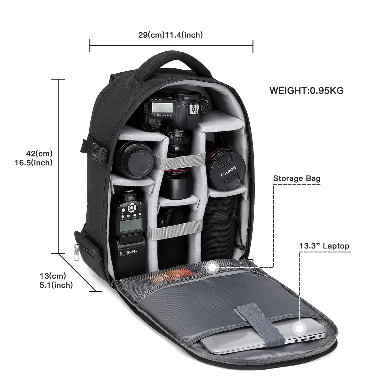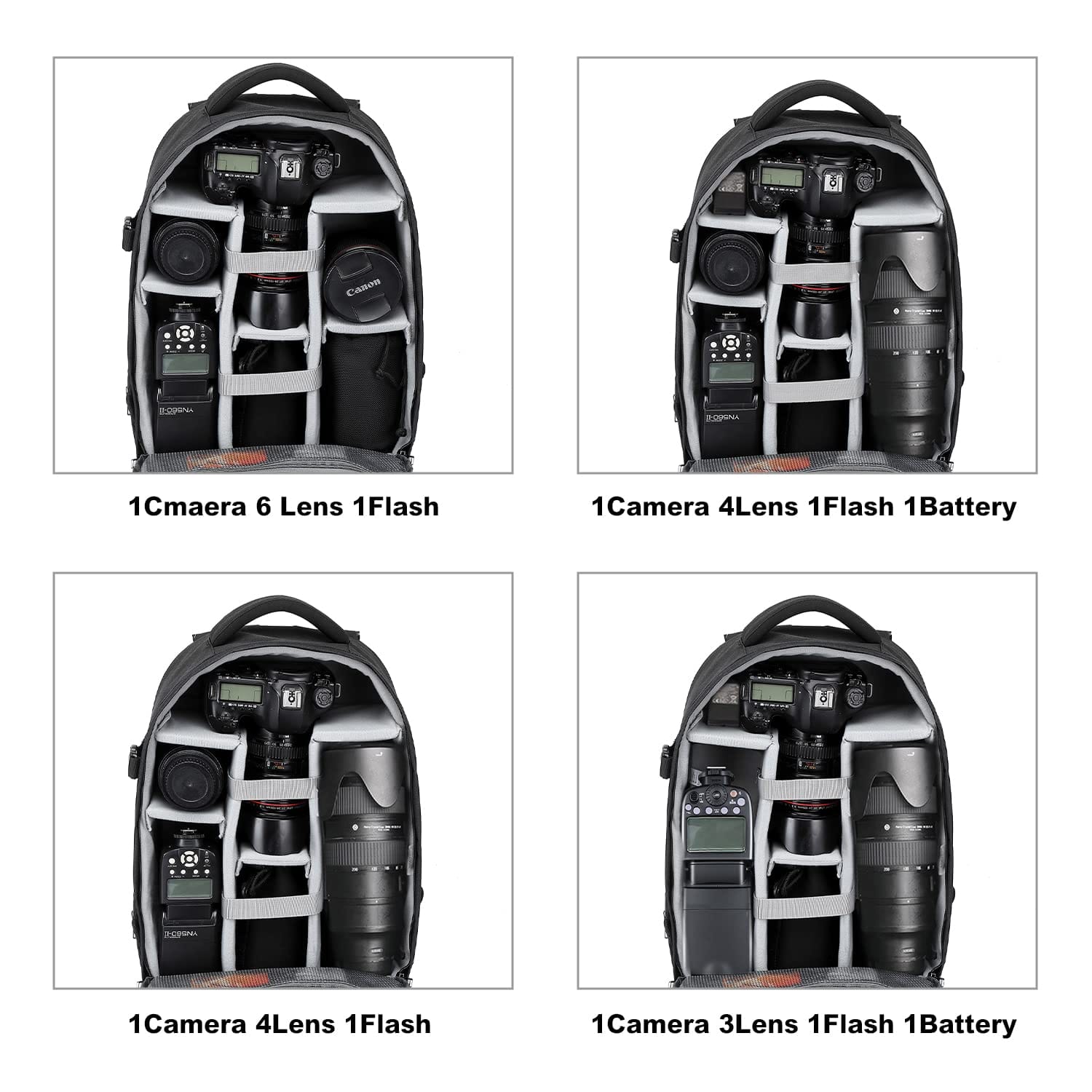 3. Wielofunkcyjność: Plecak ten posiada wytrzymałe, wyściełane przegrody, które pozwalają na oddzielenie, zorganizowanie i ochronę obiektywów, lampy błyskowej i innych akcesoriów. Może pomieścić aparaty DSLR z obiektywem o standardowym zoomie. Paski mocujące redukują wstrząsy i zapobiegają upadkowi aparatu i obiektywu. Może być również używany jako zwykły plecak, który pomieści przedmioty w formacie A4 oraz laptopy o przekątnej do 15,6 cala.