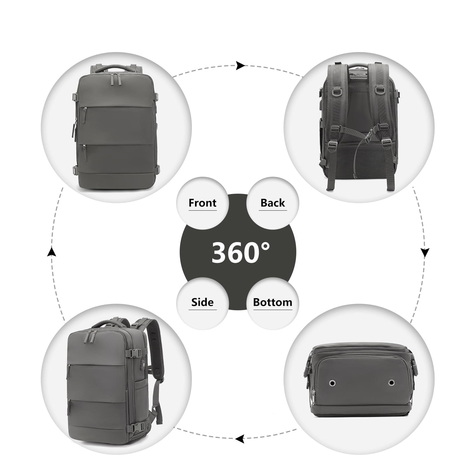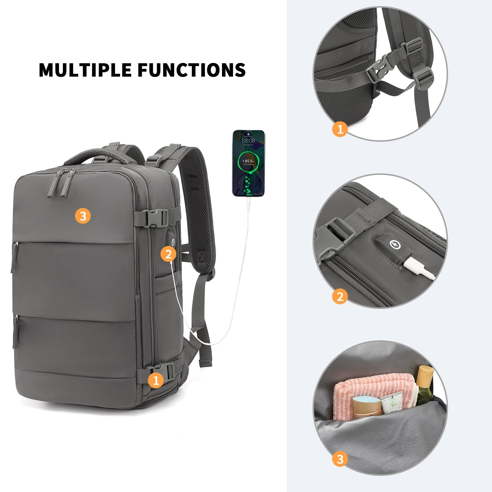 – Port ładowania USB i bezpieczeństwo: Plecak posiada wbudowany port ładowania USB na podróż. W tajnym schowku na plecach można bezpiecznie przechowywać wartościowe przedmioty. Dla urządzeń elektronicznych dostępna jest kieszeń na laptop do 15,6 cala. Dwie niewidoczne przednie kieszenie nadają się na bilety lotnicze i klucze. Główna komora jest przestronna, z prywatną kieszenią na zamek błyskawiczny oraz kilkoma przednimi kieszeniami do zorganizowanego przechowywania.