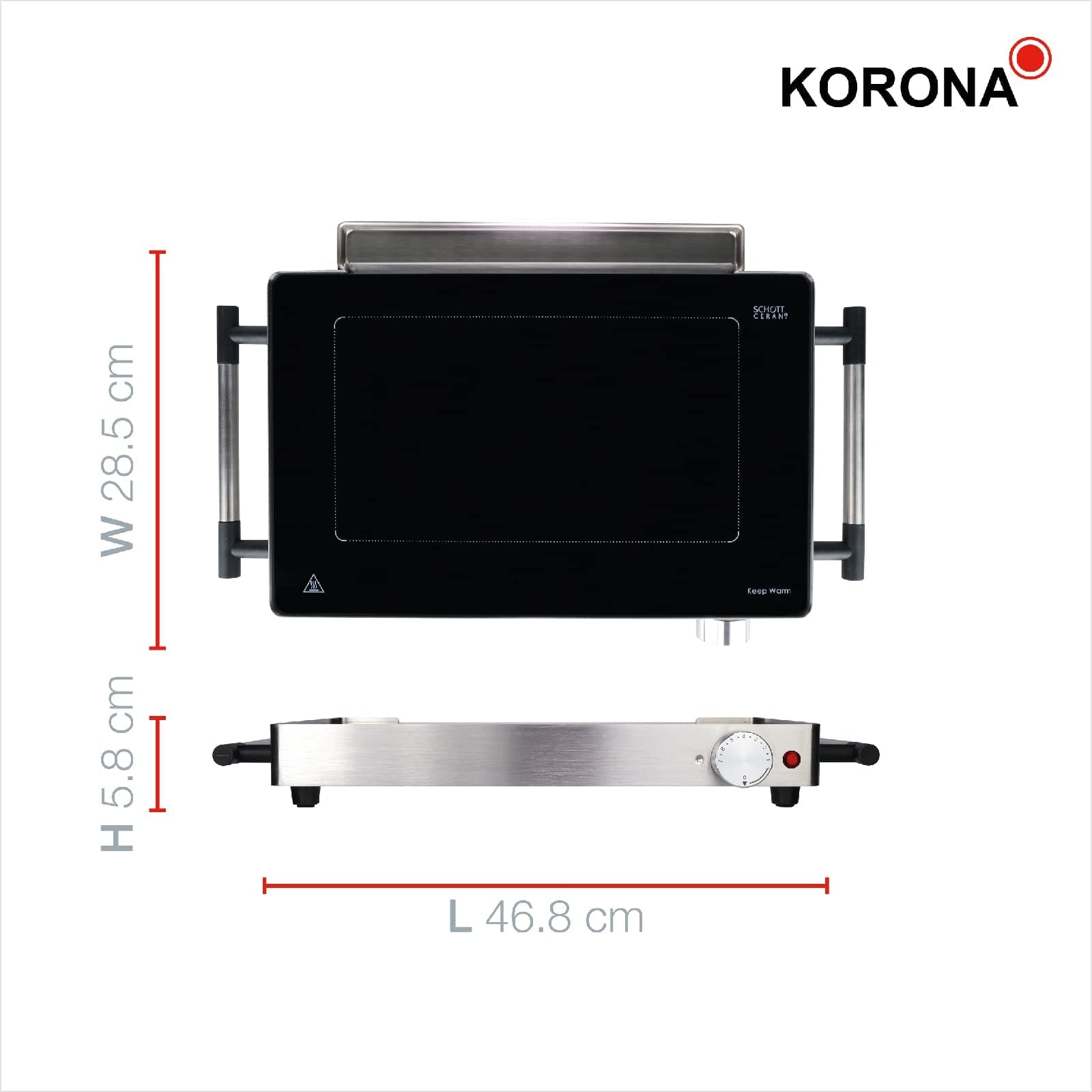 Korona 46100 Szklany grill stołowy | 2 w 1: grill stołowy i płyta grzejna | powierzchnia grillowa z niemieckiej ceramiki szklanej SCHOTT | regulowana temperatura 50-240 °C | obudowa ze stali nierdzewnej | moc 800 W