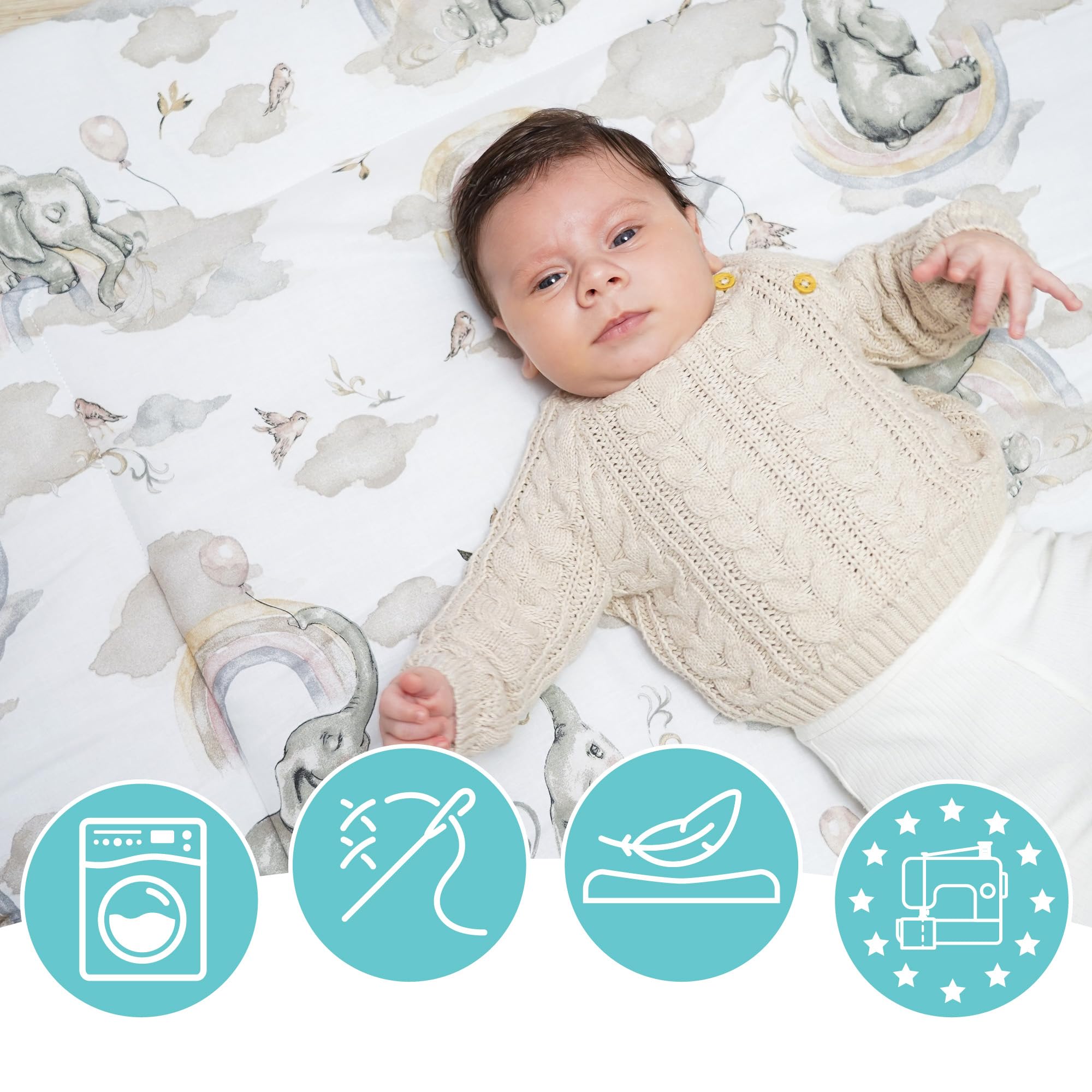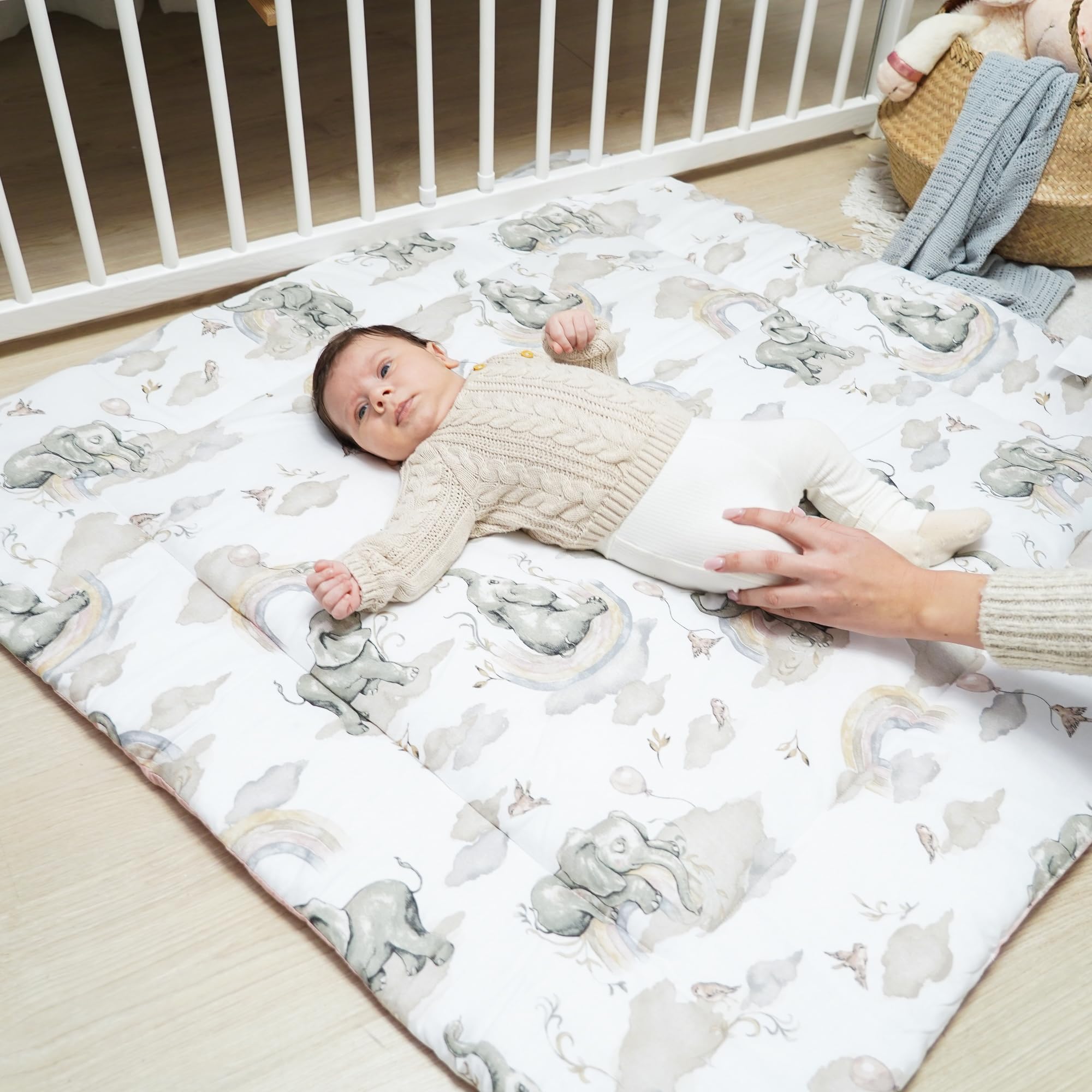 Zapraszamy do świata pełnego komfortu, bezpieczeństwa i zabawy z naszym produktem – Matą do Placu Zabaw dla Niemowląt 100×100 cm – Grubą Wyściełaną Matą do Pełzania, Matą Podłogową, Bawełnianą, Różowym Słoniem. Ta mata, zaprojektowana z myślą o najmłodszych, jest nie tylko praktyczna, ale także estetycznie wykonana, co sprawia, że jest idealnym dodatkiem do każdego pokoju dziecięcego.