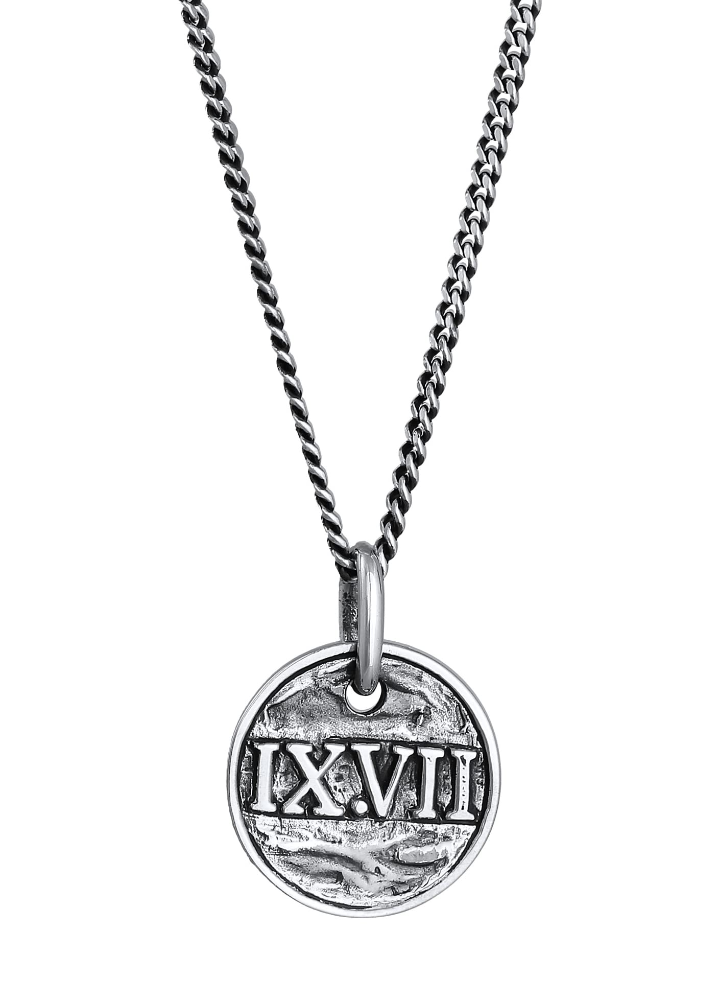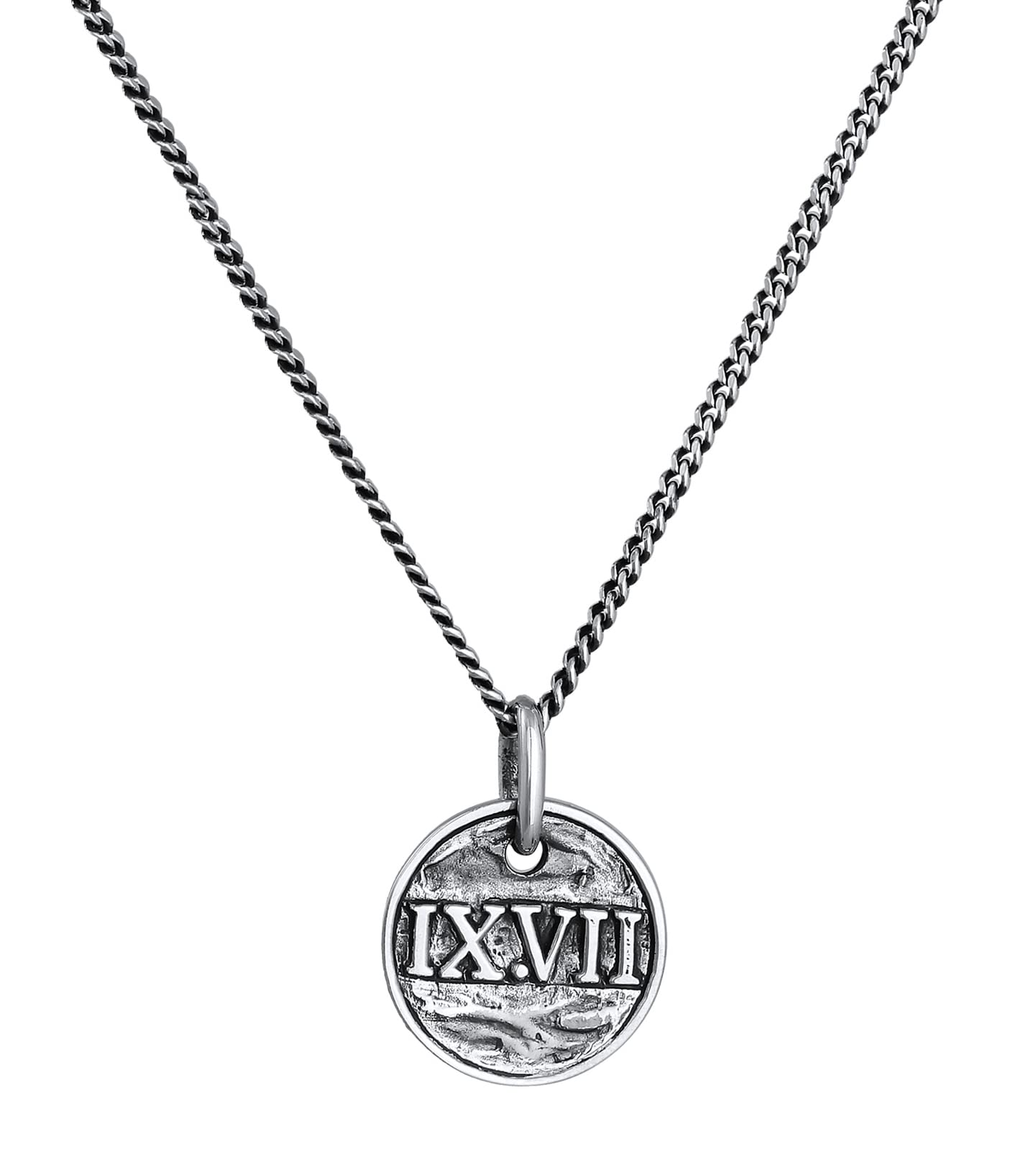 Męski łańcuszek z wisiorkiem monety – 925 srebro, rzymskie cyfry, antyczny wzór