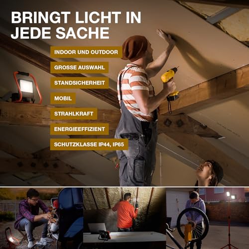 Einzelheiten: Tragbares LED-Arbeitslicht mit S-Stand. Produkteigenschaften: Sehr helle und funktionelle LED-Außenleuchten. Schutzart: IP65. Gehäuse aus Aluminiumdruckguss. Schnellverschluß zur Verstellung des Leuchtenkopfwinkels. 2 m Kabel mit Schutzkontakt-Stecker (Typ F). Produktvorteile: Gewicht- und Größenoptimierung durch kompaktes Design. Sehr homogenes Licht. Energieeffizient durch LED-Technik. Anwendungsgebiete: Außenbereiche. Parks. Garagen. Keller. Werkstatt. Renovierung. Technische Ausstattung: Vollständiges Montage- und Anschlusszubehör enthalten.