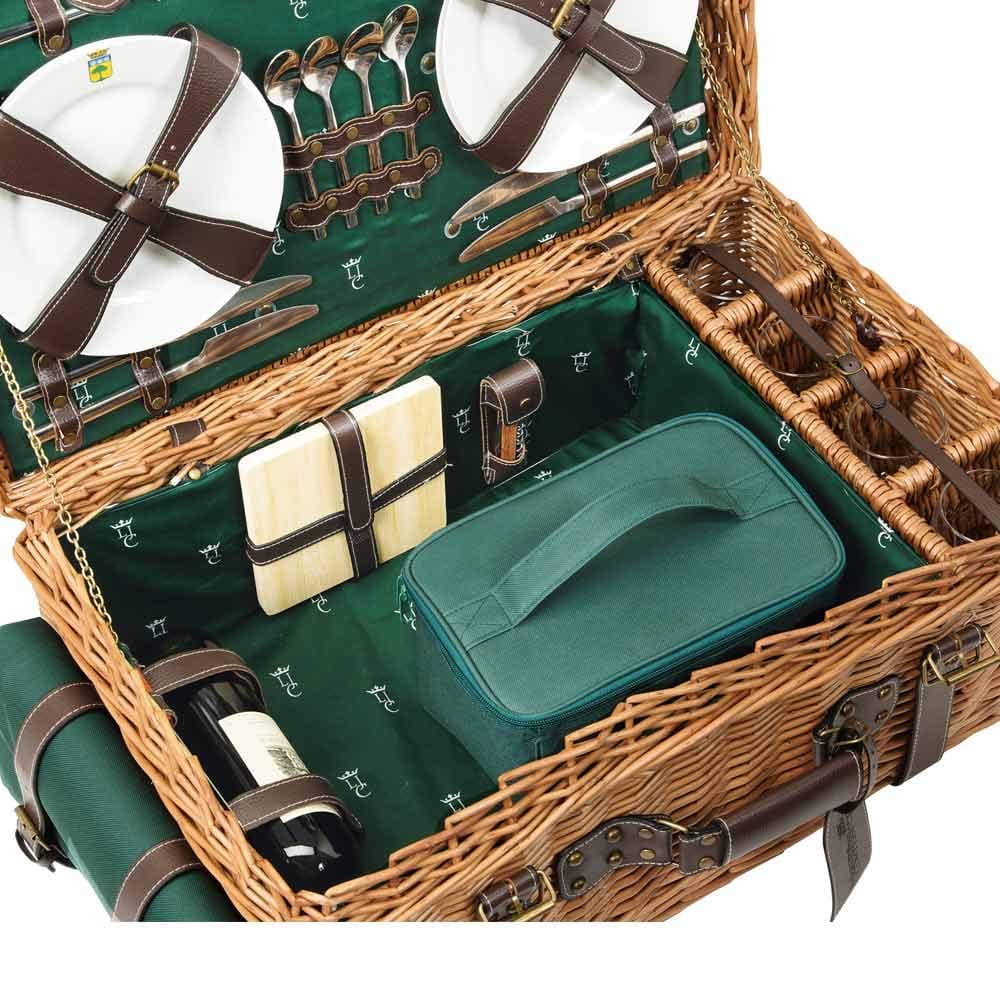 Wnętrze kosza wyposażone jest w wyściółkę z ciemnozielonej bawełny z monogramem, talerze z prawdziwej porcelany, kieliszki do wina przechowywane w oddzielnych przegródkach, butelkę wina trzymaną za pomocą dwóch skórzanych pasków, a także sztućce ze stali nierdzewnej i izolowaną komorę na żywność. Les Jardins de la Comtesse pomyślał o wszystkim, aby ułatwić Ci życie! Możesz przechowywać używane naczynia w małej wodoodpornej torbie.
