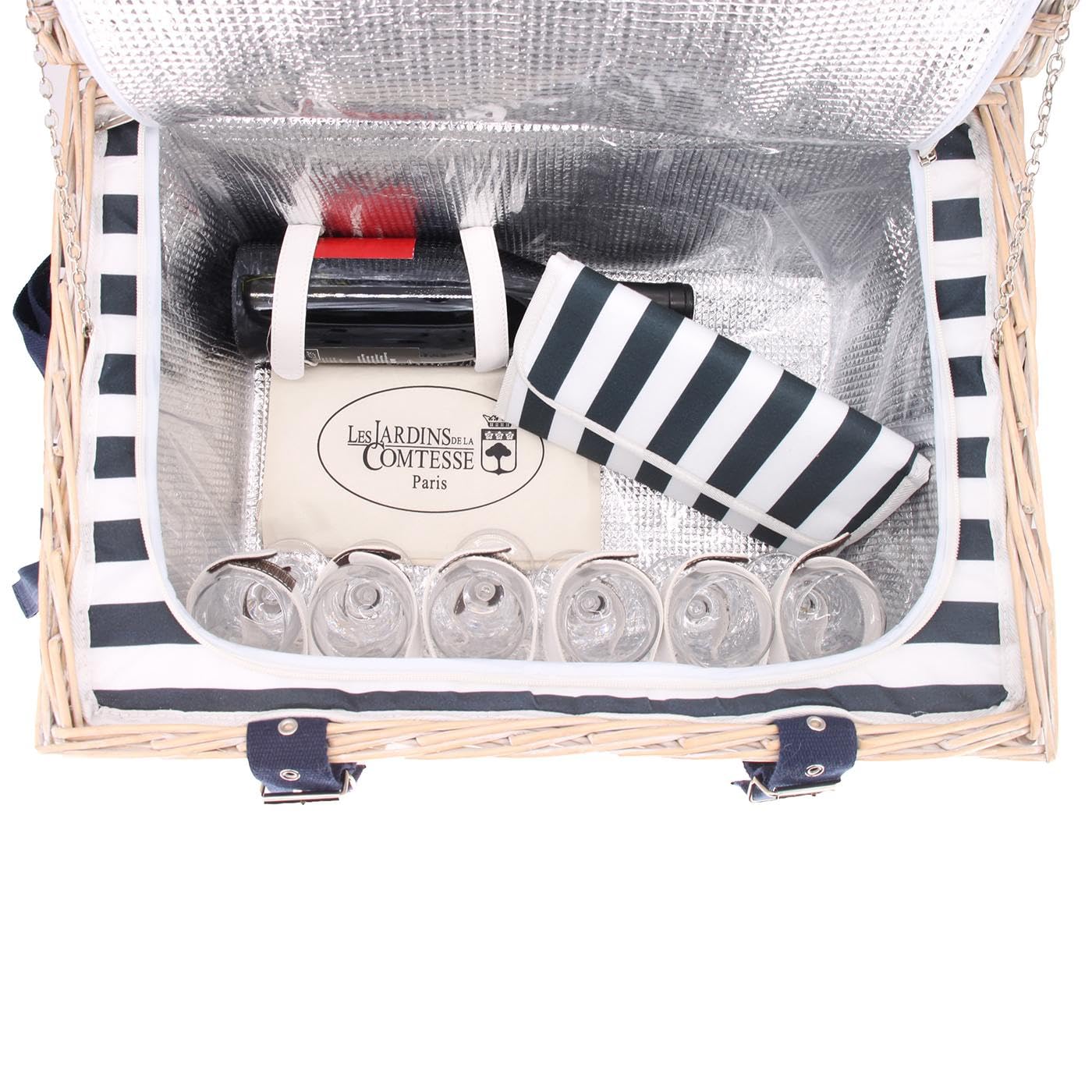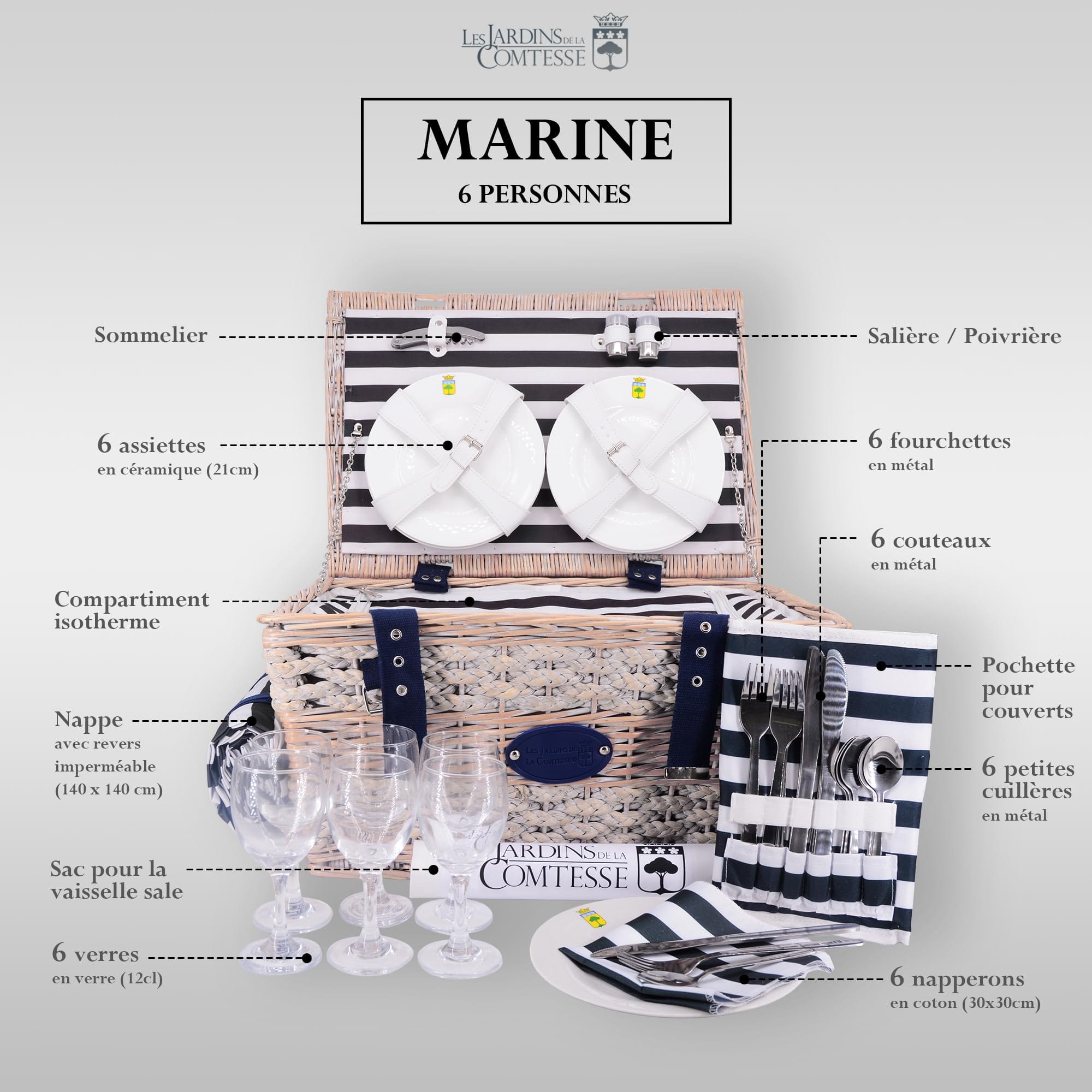 Ten kosz został zaprojektowany dla dużych rodzin i przyjaciół, którzy lubią spędzać razem uroczyste chwile na łonie natury, wśród wydm lub nad brzegiem rzeki lub morza. Dzięki centralnie umieszczonemu uchwytowi i regulowanemu paskowi na ramię z niebieskiego materiału jest łatwy do przenoszenia. Les Jardins de la Comtesse pomyśleli o wszystkim i do kosza piknikowego dołączyli małą wodoodporną torbę, w której można przechowywać naczynia po użyciu.