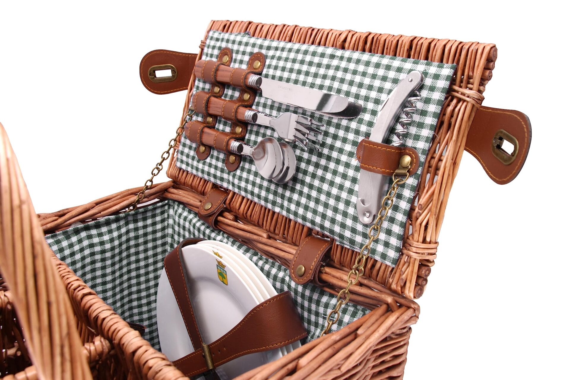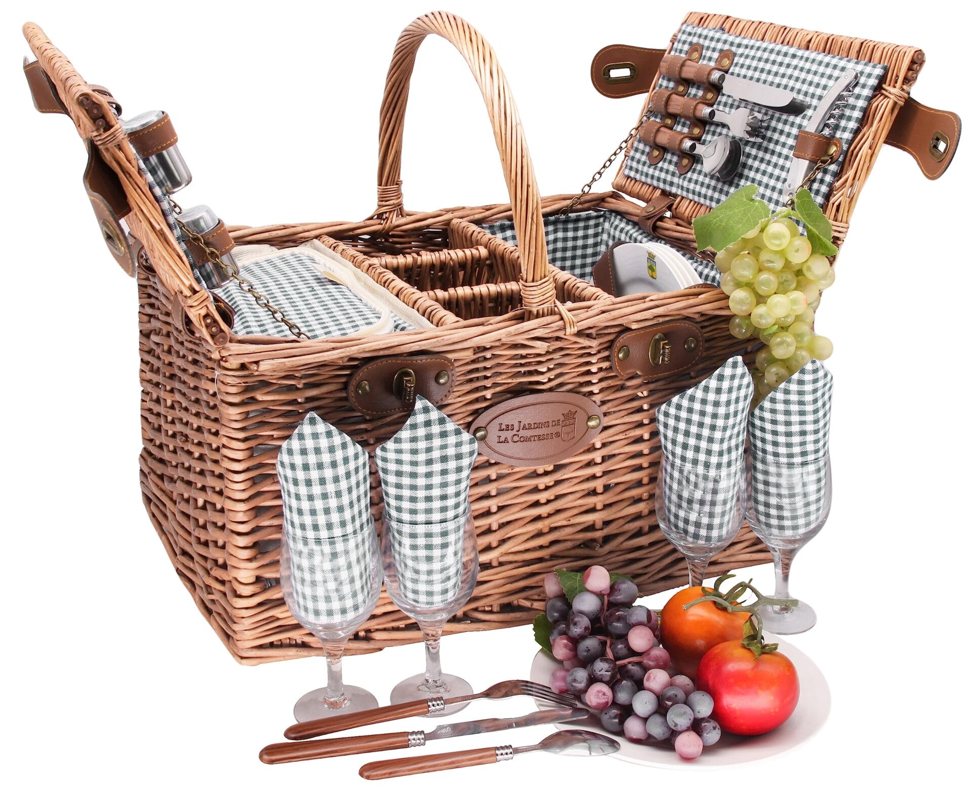Les Jardins de la Comtesse Kosz piknikowy Saint-Germain zielona kratka ciemna wiklina – kosz ze stojakiem na butelki – dla 4 osób