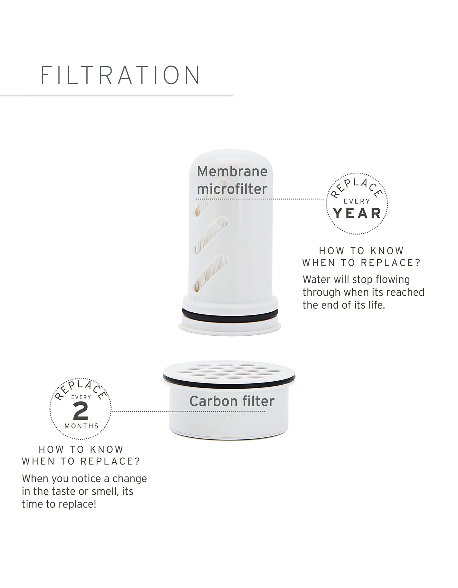 • Dołączone komponenty: Szklany dzbanek, silikonowa podstawa, obudowa filtra, filtr węglowy, filtr membranowy