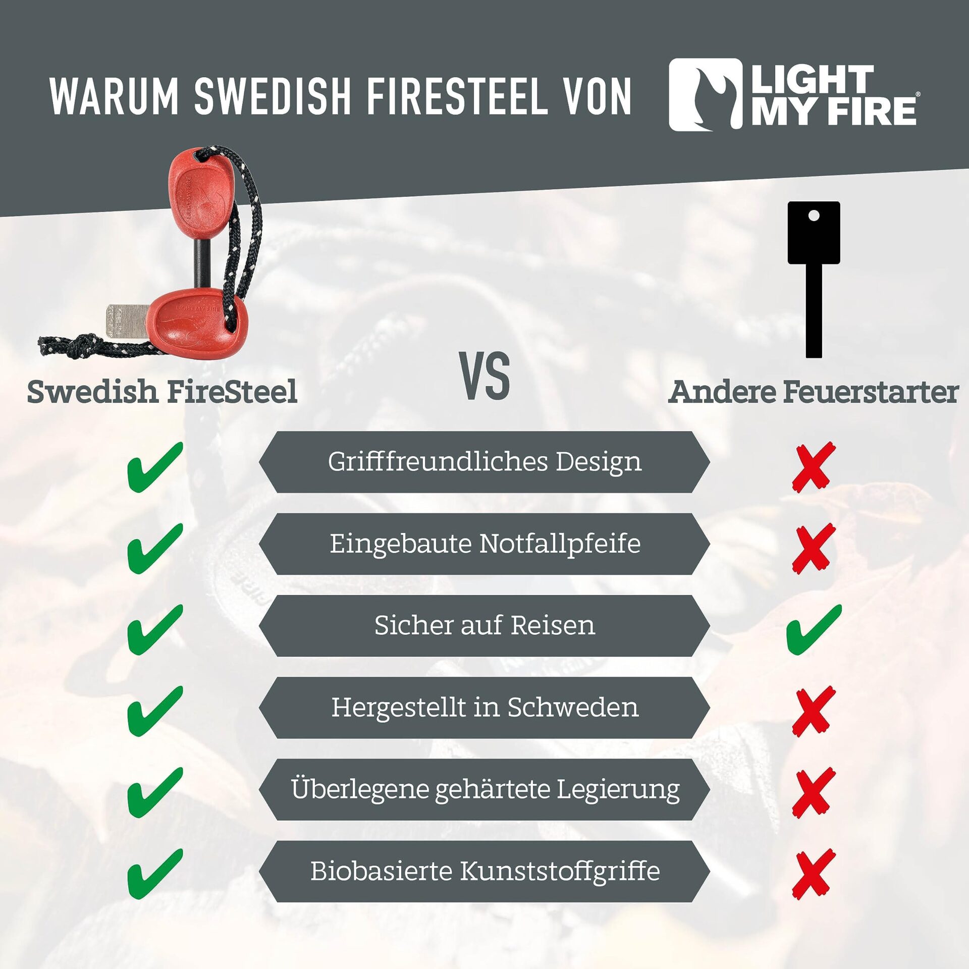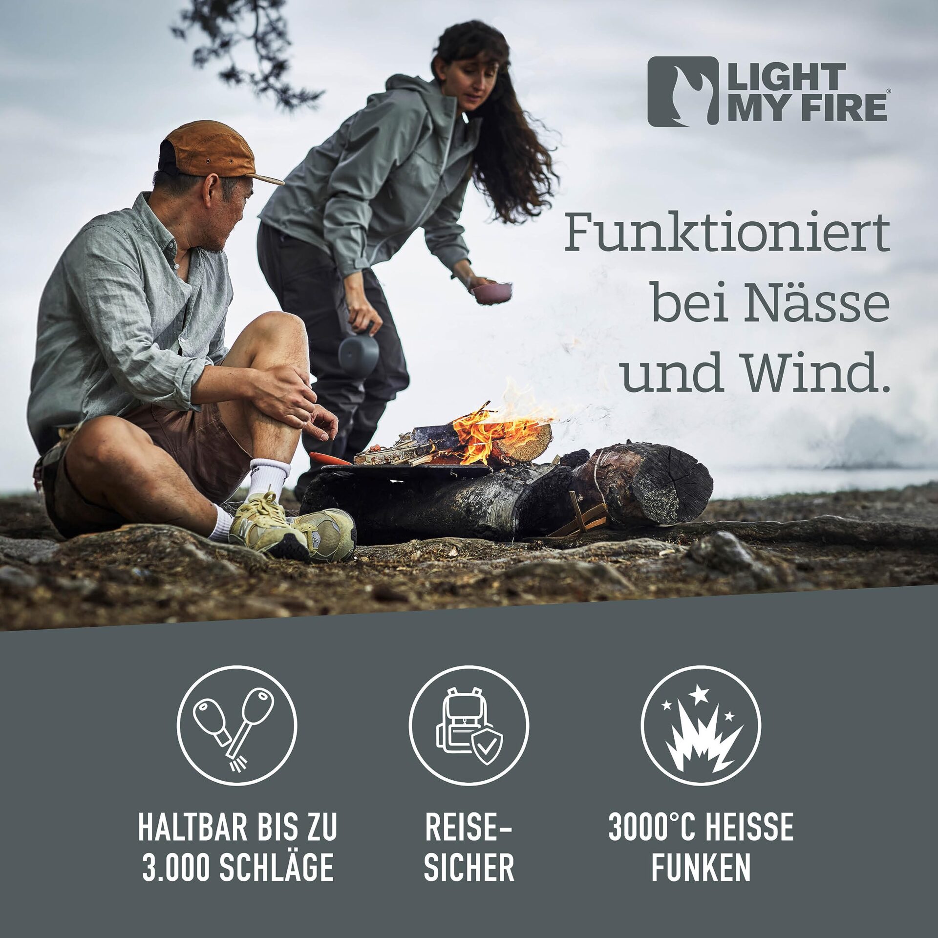 ✅ WODOODPORNY ZESTAW DO: WODOODPORNY ZESTAW DO ROZPALANIA OGNIA pozwoli Ci rozpalić ogień jak profesjonalista za pomocą niezawodnego krzesiwa i zapalnika. Krzemienne krzesiwo survivalowe Light My Fire w odróżnieniu od tanich modeli, które nie sprawdzają się w złych warunkach pogodowych, działa zawsze, nawet jeśli jest mokro