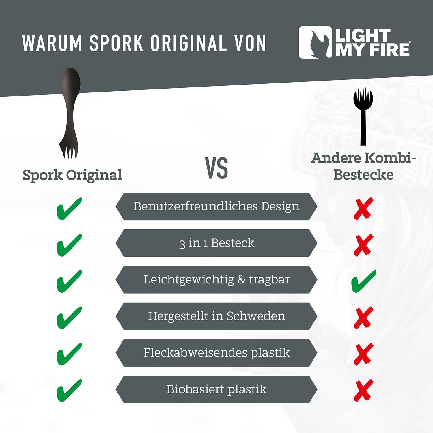 ✅ Ten produkt zawiera: Ten produkt zawiera – 4 x Spork Light My Fire – przyjazne dla środowiska, zrównoważone i kompostowalne bio-tworzywo sztuczne bez BPA. Nadaje się do kuchenki mikrofalowej i mycia w zmywarce. Posiadamy również pudełko na sztućce w podróży, w którym można przechowywać sztućce piknikowe. Aby uzyskać wię