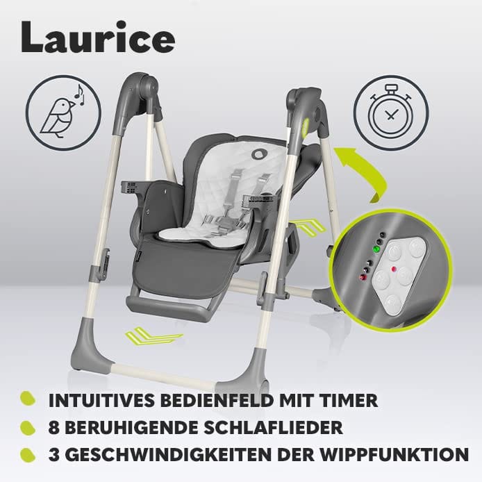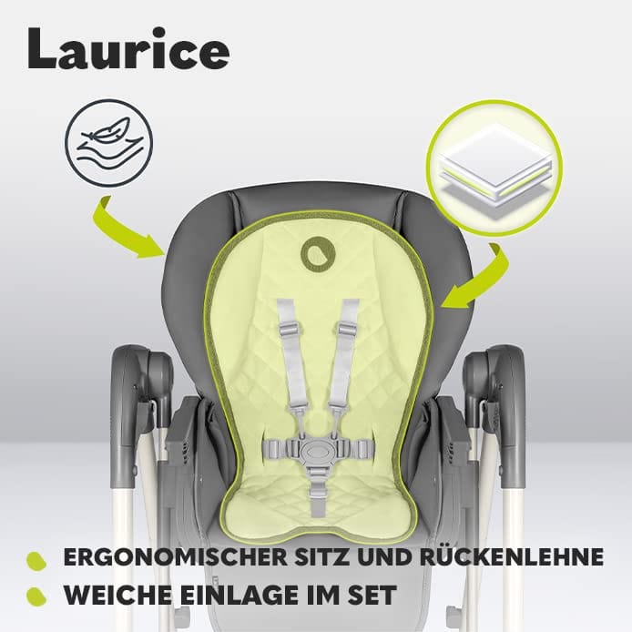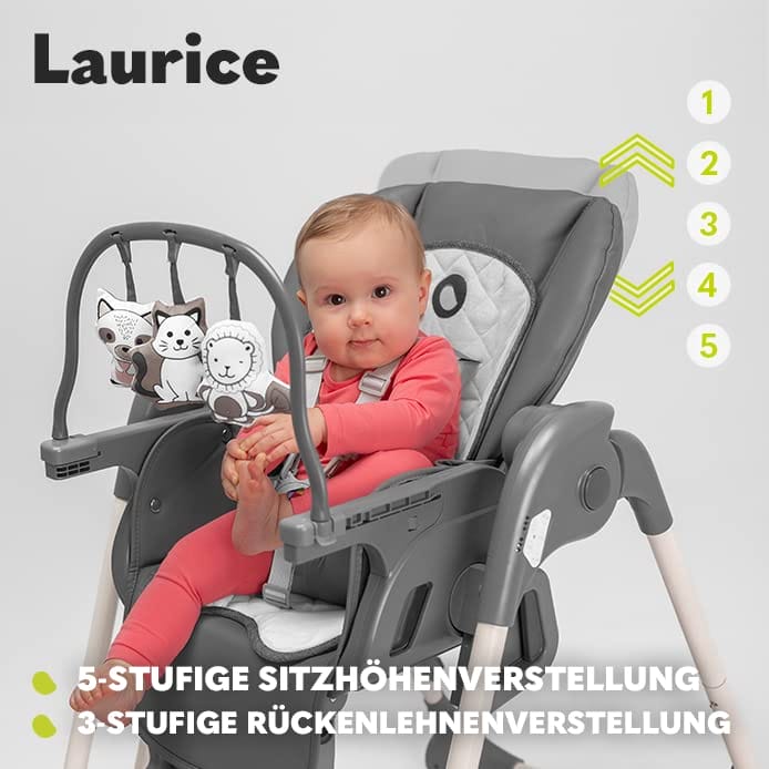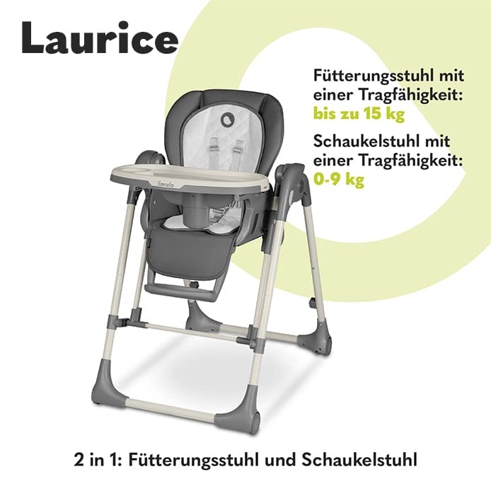 • FUNKCJONALNOŚĆ: opcja 2 w 1 – produkt Laurice jest jednocześnie krzesełkiem do karmienia oraz bujakiem (maks. waga 9kg). Krzesełko będzie odpowiednie dla dzieci od 6 do 36 miesięcy lub do osiągnięcia wagi 15 kg. Model Laurice umożliwia nie tylko wygodne karmienie malucha, samodzielną naukę jedzenia czy relaks, ale też opcje do zabawy dziecka