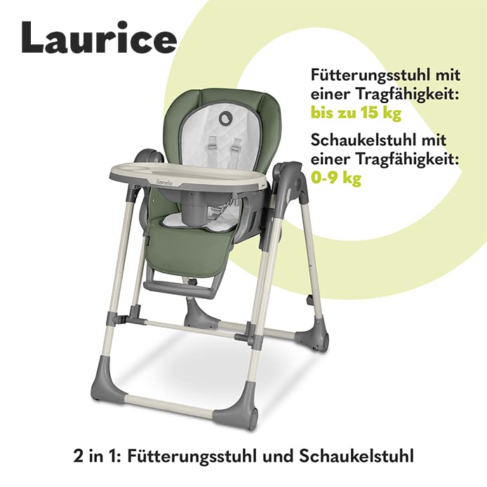 LIONELO Laurice to wyjątkowe wysokie krzesło dziecięce, które łączy w sobie funkcjonalność i komfort, idealne dla maluchów w wieku od 6 do 36 miesięcy (do 15 kg). Jego unikalna cecha to możliwość przekształcenia w bujak, co sprawia, że jest to produkt 2 w 1, który zaspokaja różnorodne potrzeby rodziców i dzieci.
