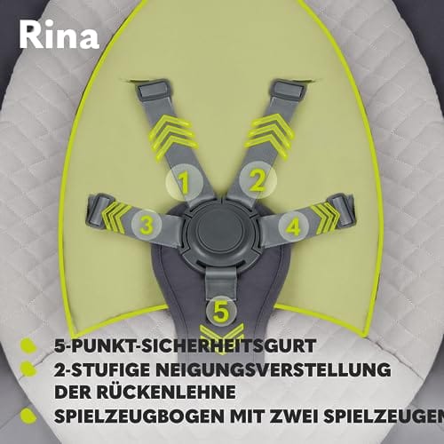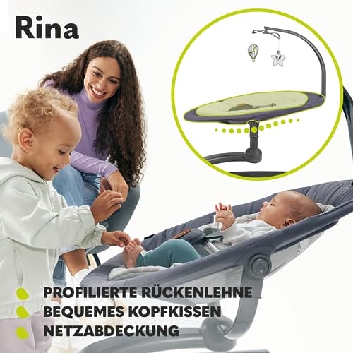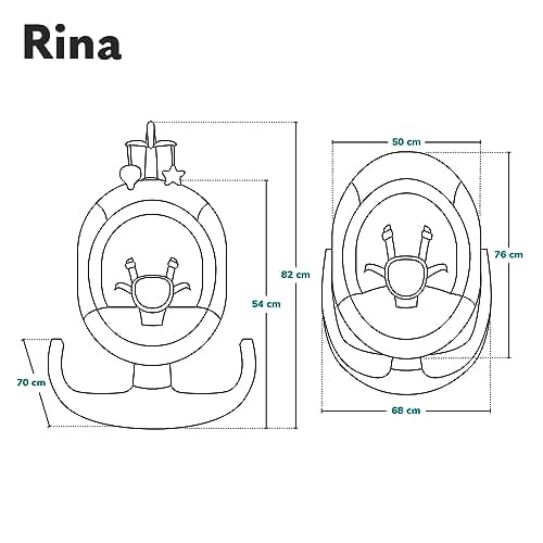 • BABYWIPPE: RINA umożliwia bujanie w dwóch kierunkach: od przodu do tyłu i od prawej do lewej. Wyposażony w dotykowy panel sterowania, pilot, 12 wbudowanych melodii oraz timer, który można ustawić na 8, 15 lub 30 minut.