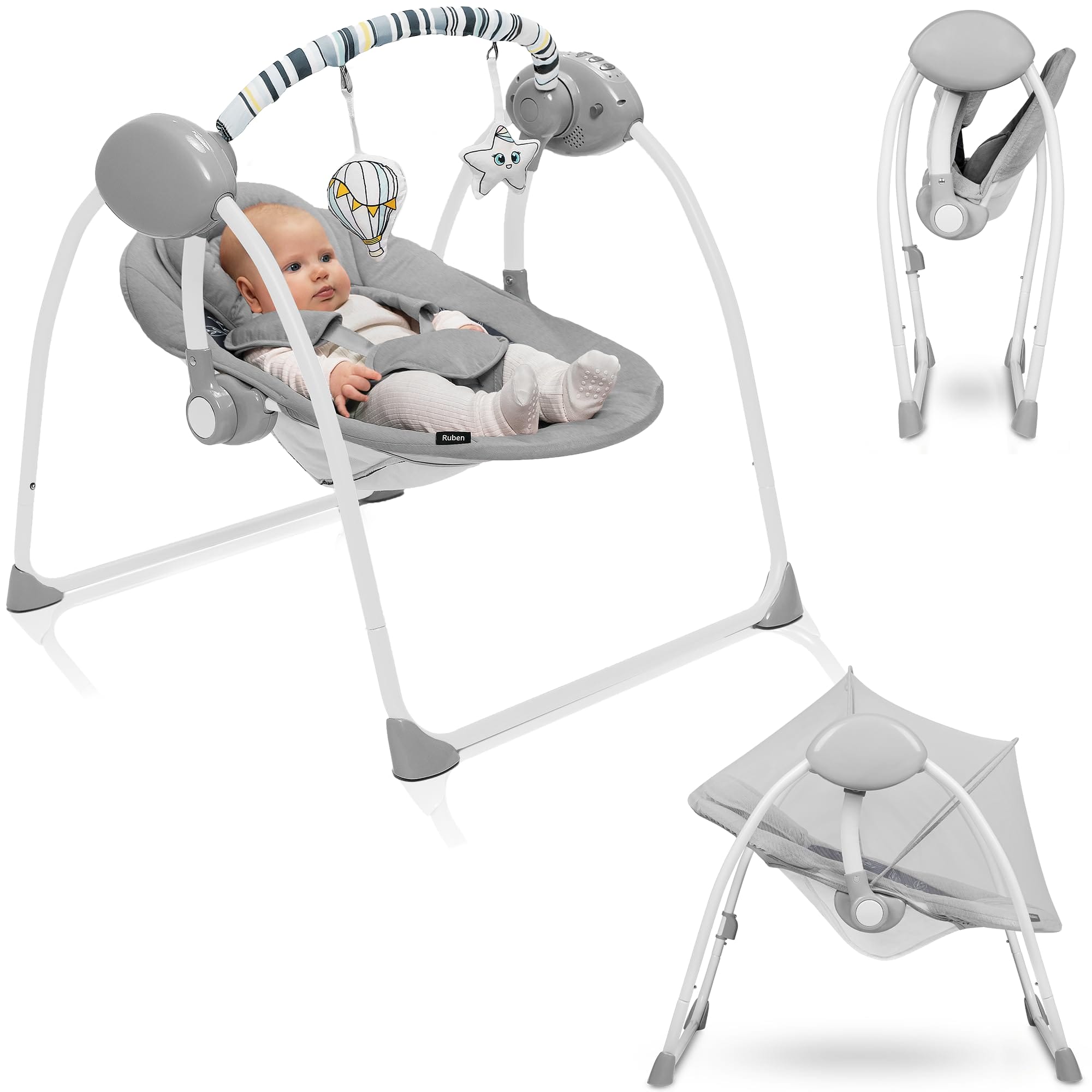 LIONELO Ruben bujaczek wbudowane melodie i dźwięki natury z regulacją głośności 5 prędkości bujania zasilanie sieciowe lub na baterie timer bezgłośna praca moskitiera w zestawie (GREY)