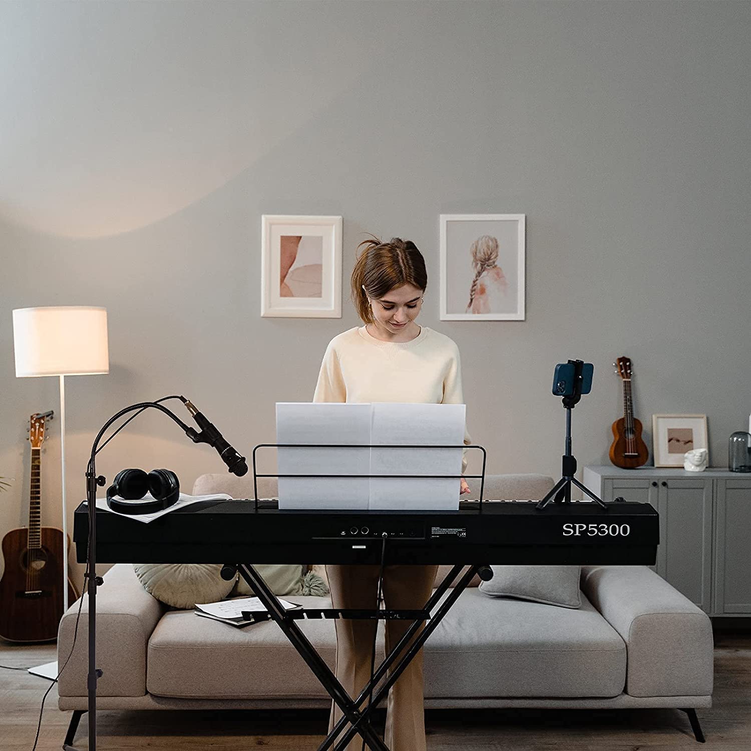 The stand also features a built-in phone holder, making it easy to keep your device within reach for quick access to lyrics, scripts, or music sheets. This added convenience eliminates the need for additional accessories and keeps your workspace clutter-free.