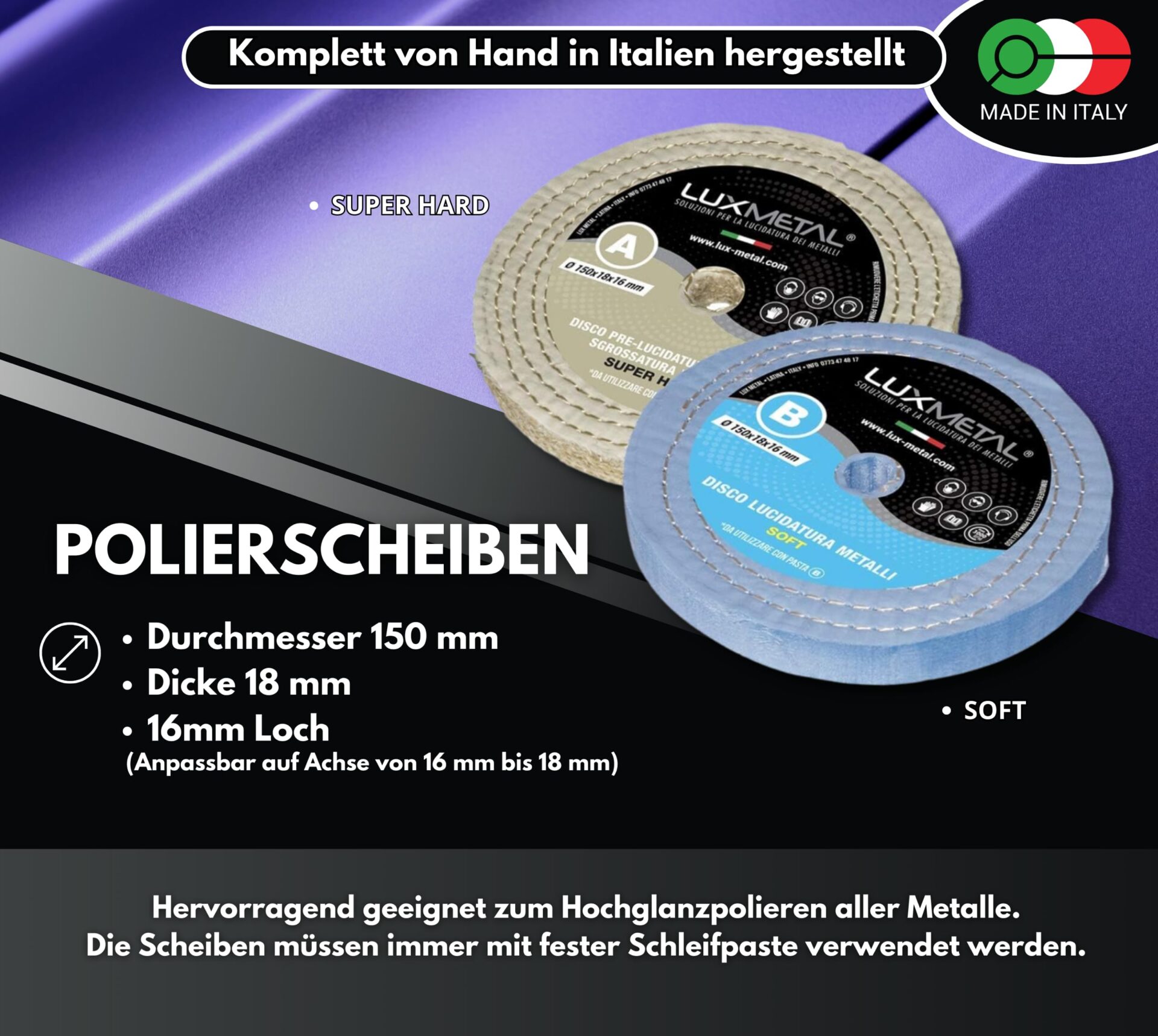 Zestaw 2 tarcz polerskich o średnicy 150 mm Lux Metal to doskonałe narzędzie do polerowania różnych powierzchni, takich jak stal nierdzewna, mosiądz, miedź, brąz, żelazo, drewno, plastik i wiele innych. Tarcze wykonane są z wysokiej jakości materiałów, takich jak sizal i bawełna, co sprawia, że są one idealne do usuwania tlenków aluminium i innych zanieczyszczeń z powierzchni metalowych.