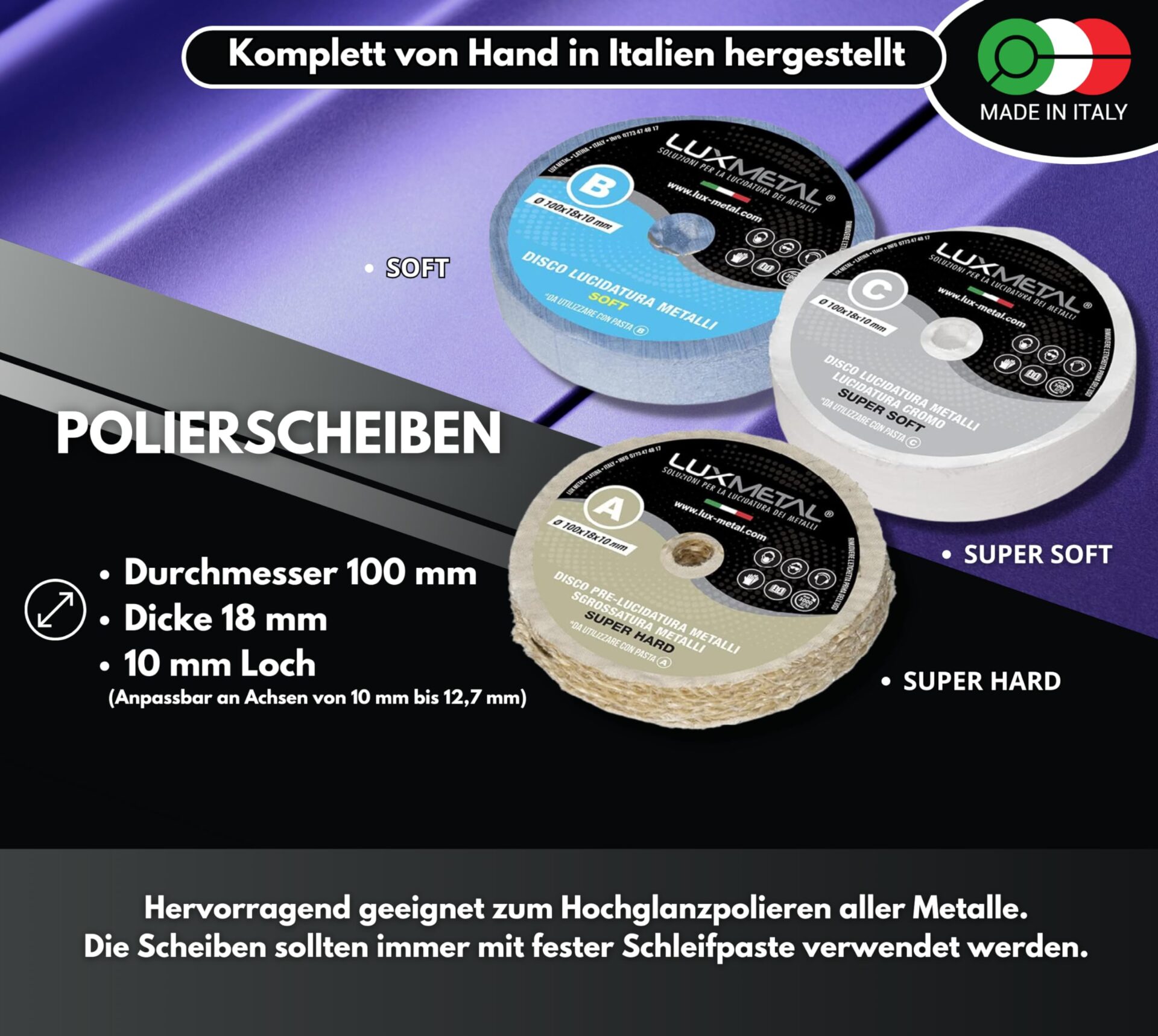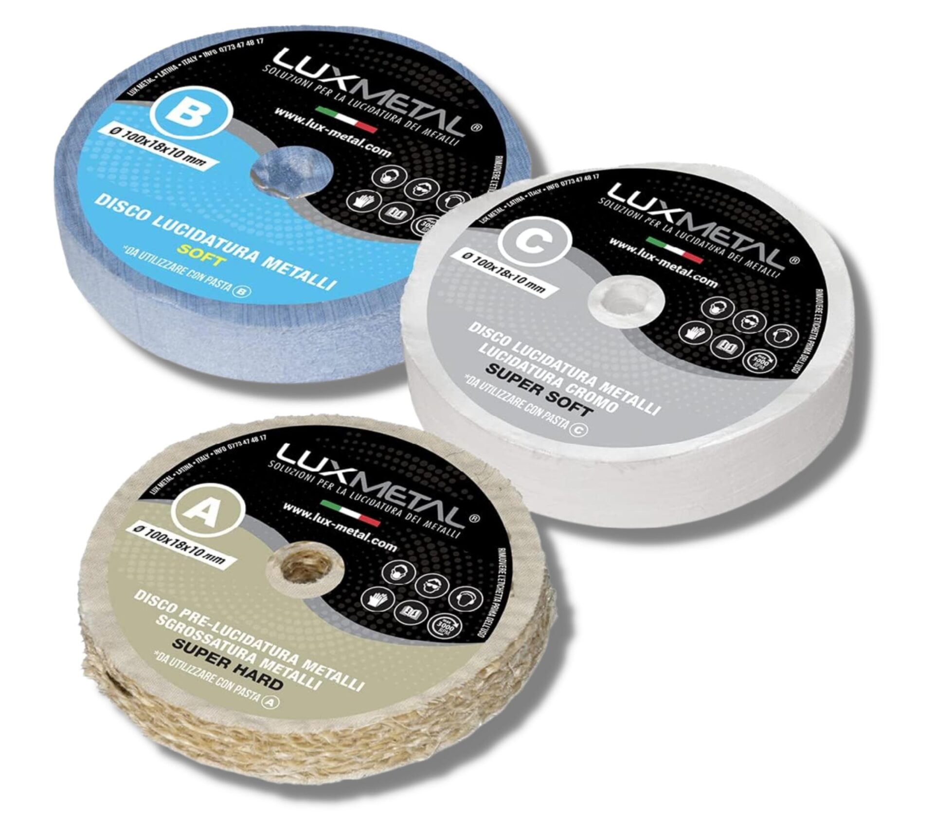 • Zestaw 3 tarcz o średnicy 100 mm Sisal / Super Hard – Bawełna / Soft – Miękka bawełna / Super Soft , Doskonały do polerowania lustrzanego wszystkich metali, również idealny do marmuru drewno pleksi lexan abs . Dyski należy zawsze używać z solidną pastą ścierną