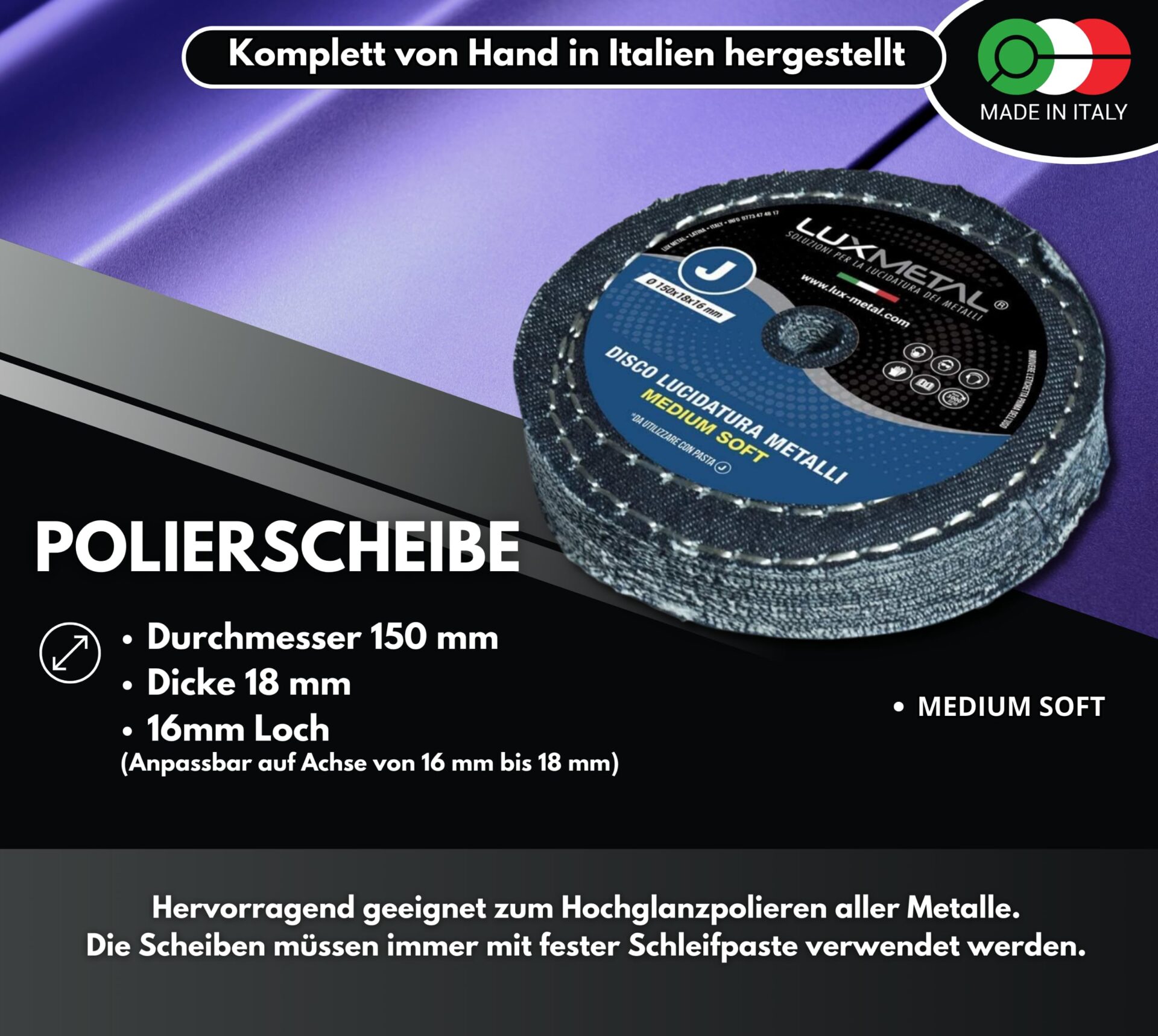 Tarcza szlifierka koła do polerowania Lux Metal bawełna/Dżinsy J Medium Fine 150 mm to doskonałe narzędzie do polerowania różnych metali, takich jak aluminium, stal nierdzewna, mosiądz, miedź, brąz czy żelazo. Dzięki tej tarczy można skutecznie eliminować tlenek i rdzę, pozostawiając powierzchnię lśniącą jak lustro.