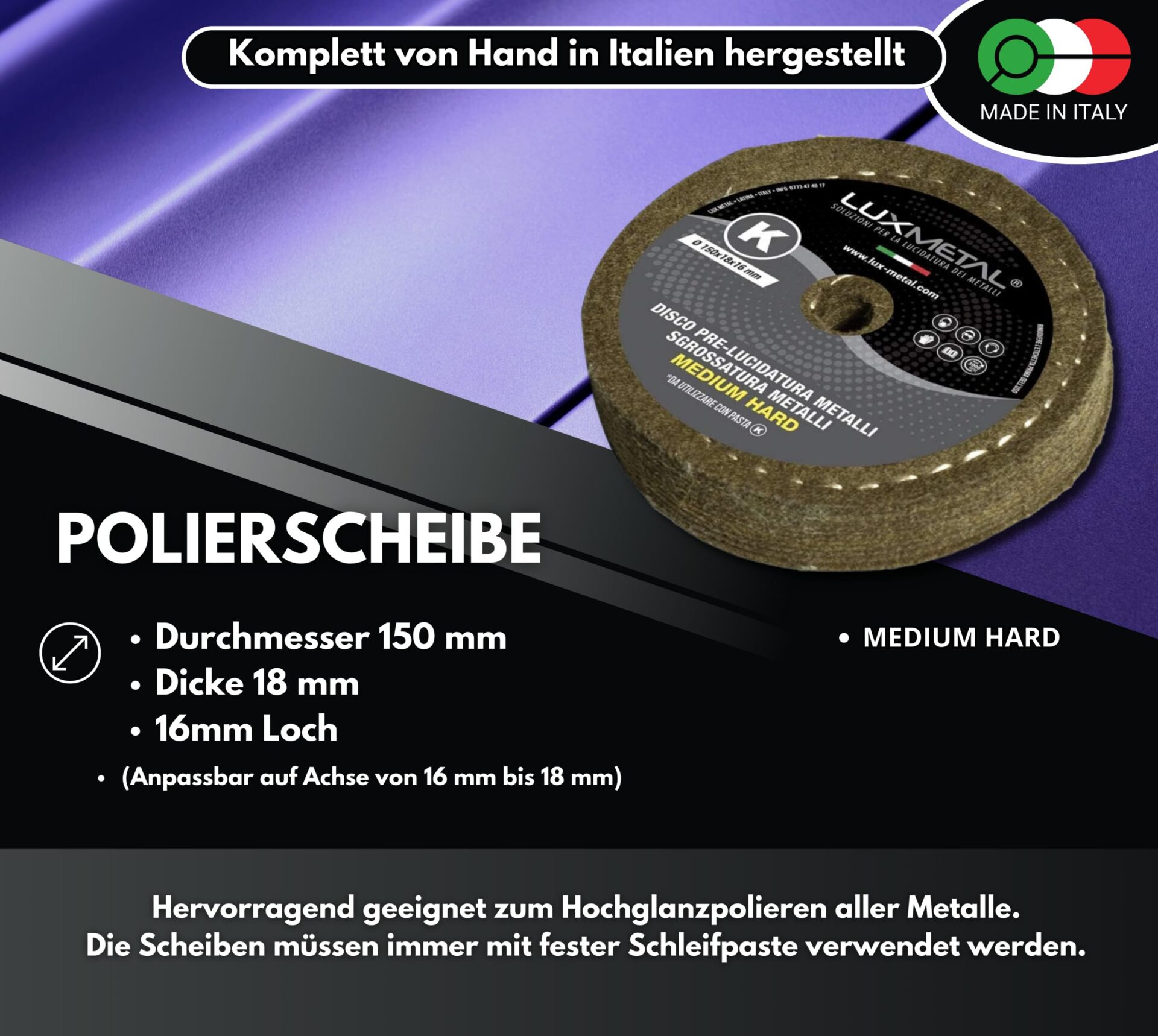 Wartość tarczy ścierniczej koła 150 mm wstępnie polerowanie ścierne Lux Metal Wełna/Filc K Medium tkwi w jej skuteczności, trwałości i łatwości użycia. Dzięki temu narzędziu, użytkownik może szybko i profesjonalnie przygotować metalowe elementy do dalszego polerowania, osiągając doskonałe efekty bez konieczności dużego nakładu pracy. Jest to niezbędne narzędzie dla każdego, kto zajmuje się obróbką metali i dba o wysoką jakość wykończenia.