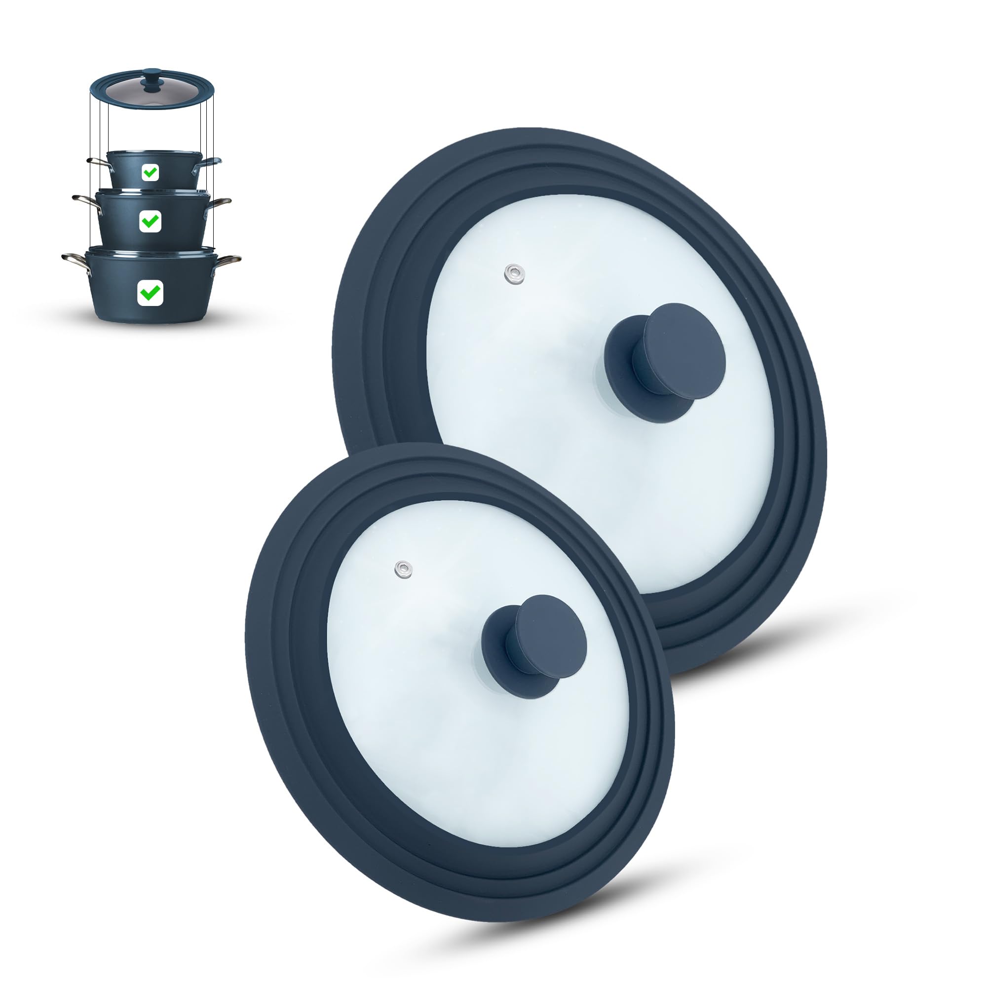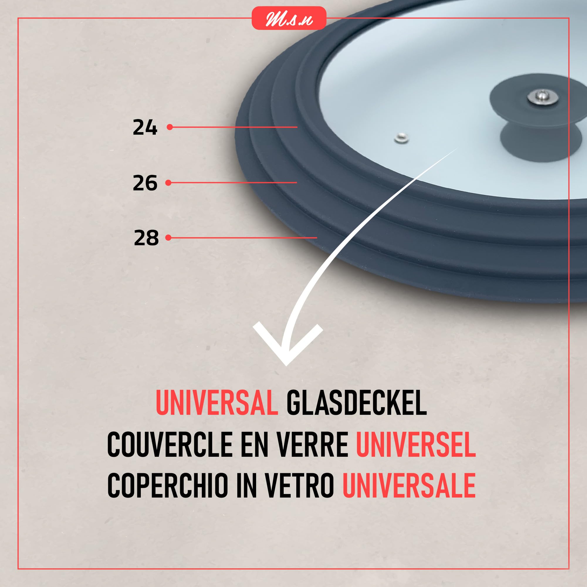 M.S.N Zestaw 2 uniwersalnych pokrywek szklanych, 2-częściowy, garnki i patelnie 16/18/20 cm i 24/26/28 cm, z zaworem wylotowym i silikonową krawędzią (szary, 16/18/20-24/26/28 cm)