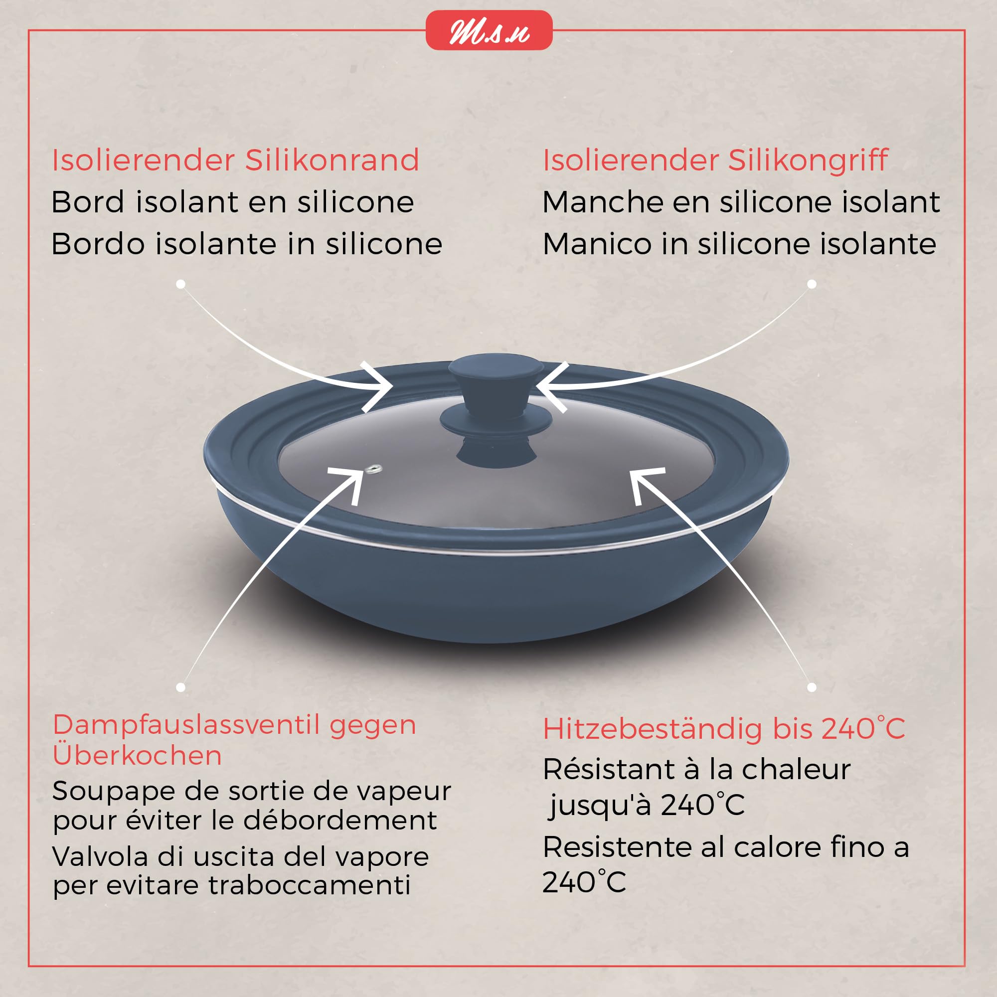 ✅ Stopniowana silikonowa krawędź: Stopniowana silikonowa krawędź gwarantuje niewielką utratę ciepła i jednocześnie chroni garnki i patelnie przed zadrapaniami, bez oparzeń dłoni dzięki silikonowej gałce.