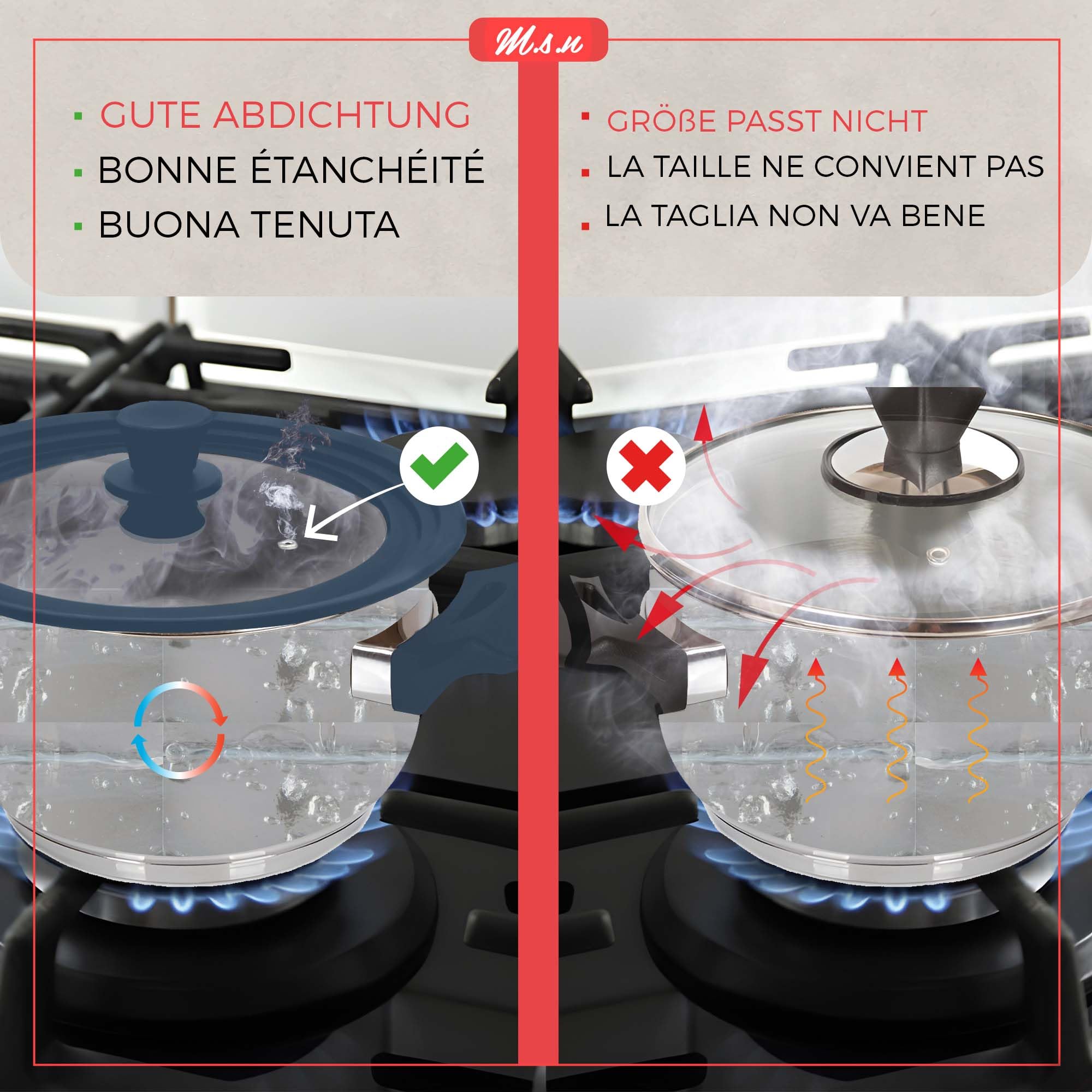 ✅ Nasze uniwersalne wieczka: Nasze uniwersalne wieczka pasują do patelni i garnków o 3 różnych rozmiarach Ø 16 cm, Ø 18 cm, Ø 20 cm – Ø 24 cm, Ø 26 cm, Ø 28 cm dzięki stopniowanemu silikonowemu ściągaczowi. Wieczka ze szkła z silikonowym ściągaczem, silikonowy uchwyt.