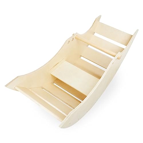 • W środku bujaka znajduje się drewniana ławeczka, na której dziecko może wygodnie usiąść i bezpiecznie się kołysać