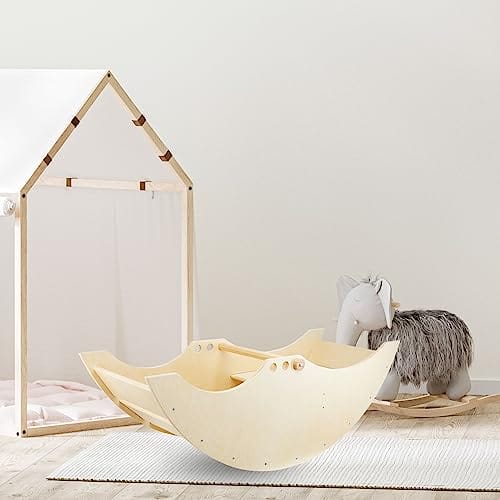 • Konstrukcja bujaczka jest solidna i wytrzymała, zapewniając pełne bezpieczeństwo podczas użytkowania. Zaokrąglone ranty i gładka, wyszlifowana powierzchnia eliminują ryzyko potencjalnych uszkodzeń. Ten drewniany bujaczek to nie tylko zabawka ale również element wystroju wnętrza